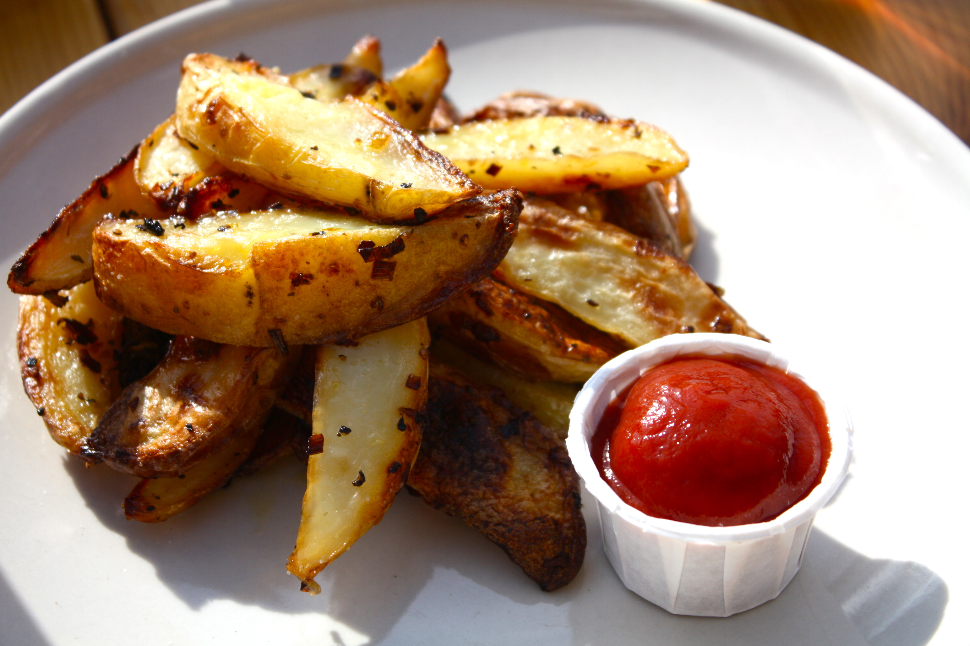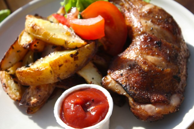 Server sammen med ketchup, salat og nygrillet kyllinglår. Deilig sommerkos.