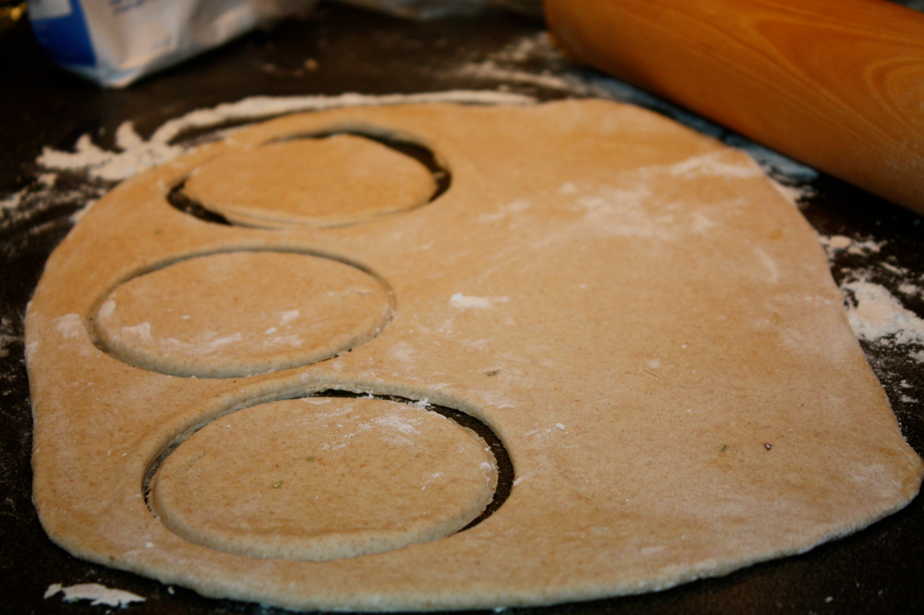 4. Kjevle ut pizzadeigen, og bruk en litt stor kopp til å lage rundinger som du legger du former ned i hver cupcakeform.
