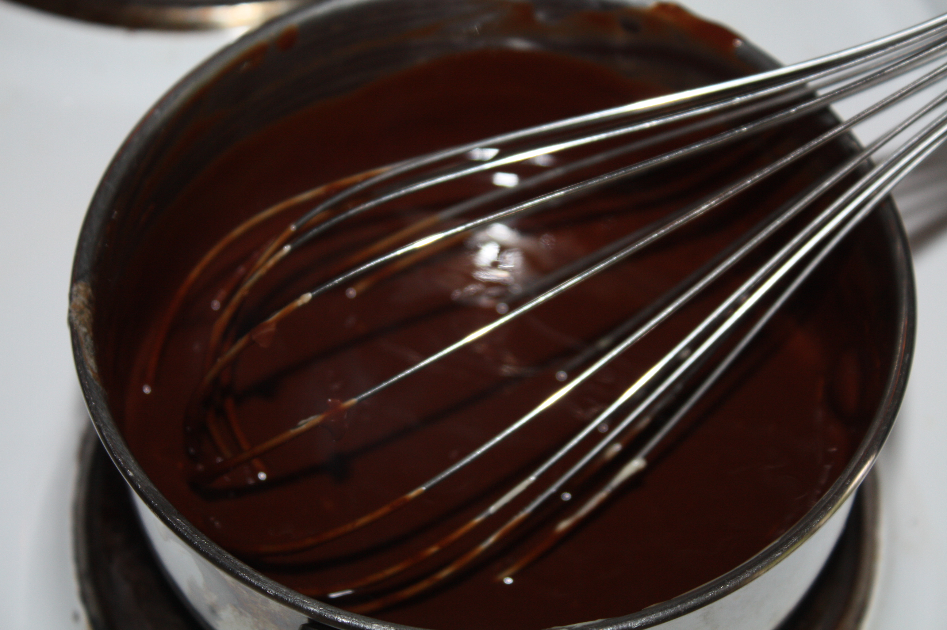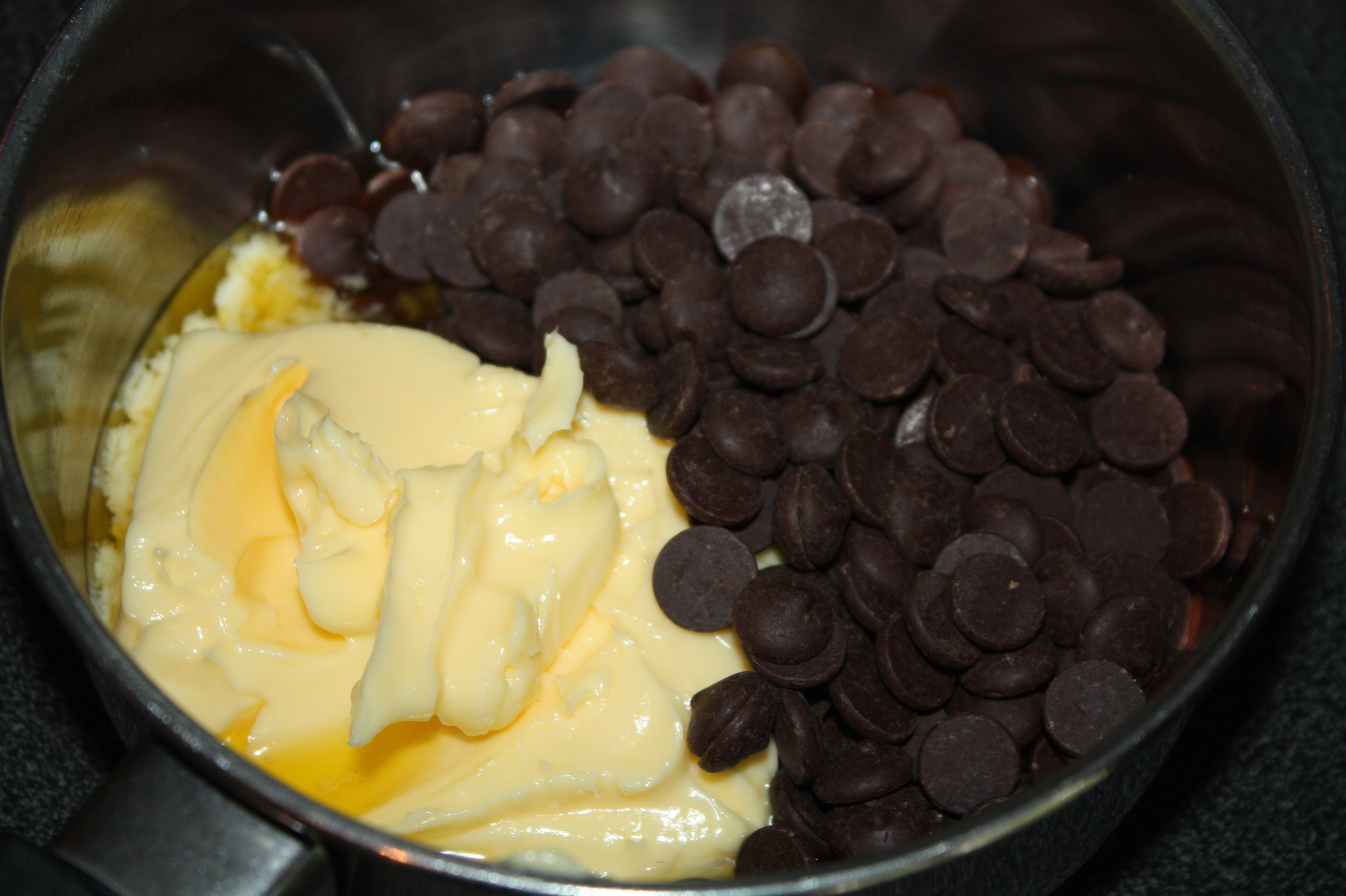 1. Smelt sjokoladen og smøret sammen på lav varme.