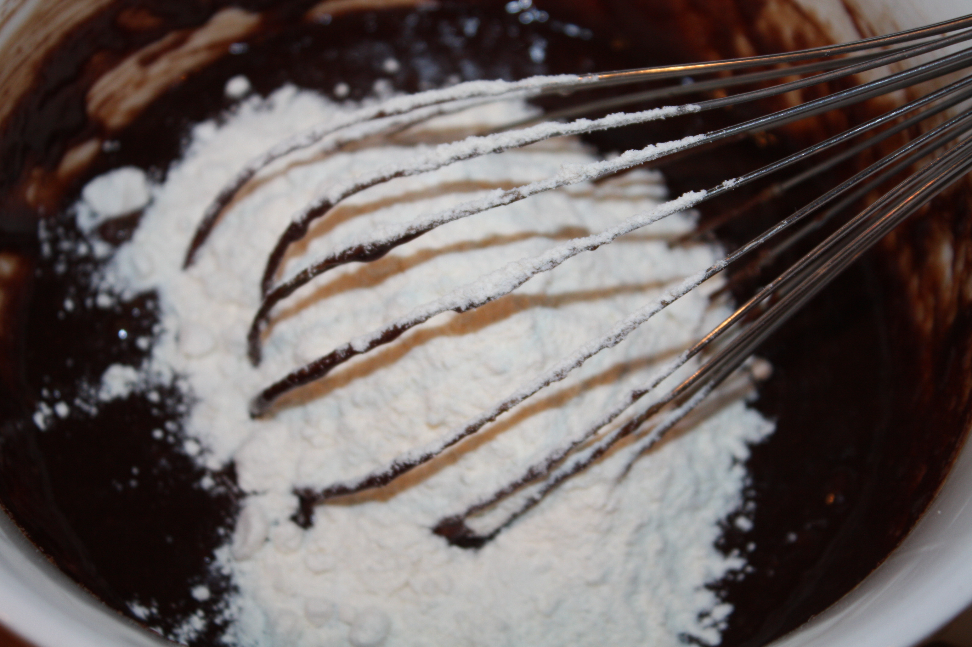 5. Sikt inn hvetemel og valnøtter, og rør godt videre til røren blir fyldig og tykk.