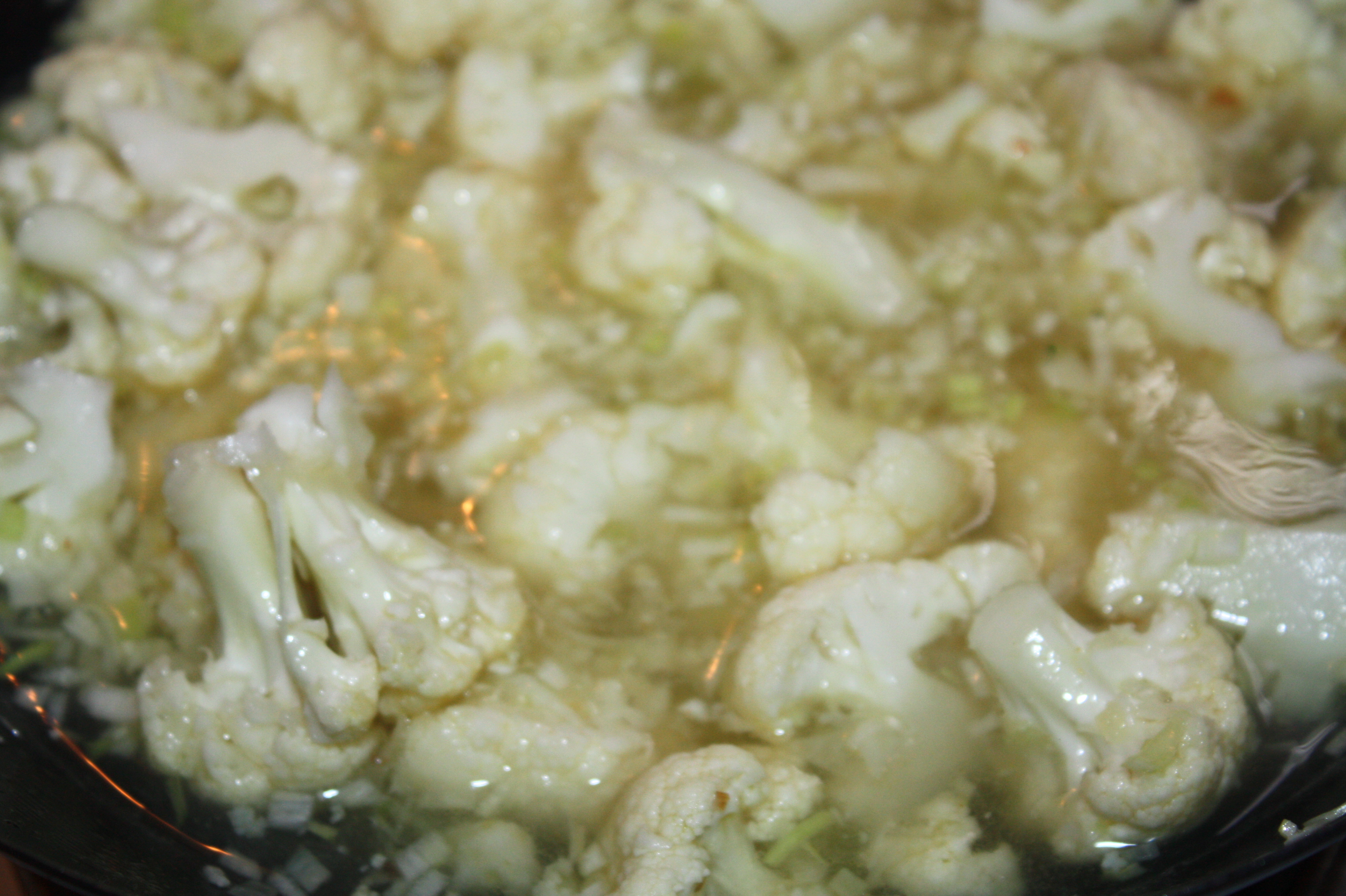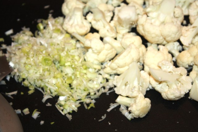 2. Fres blomkålen, purreløken, revet hvitløk i en dyp panne( jeg brukte en wokpanne) sammen med litt olje.