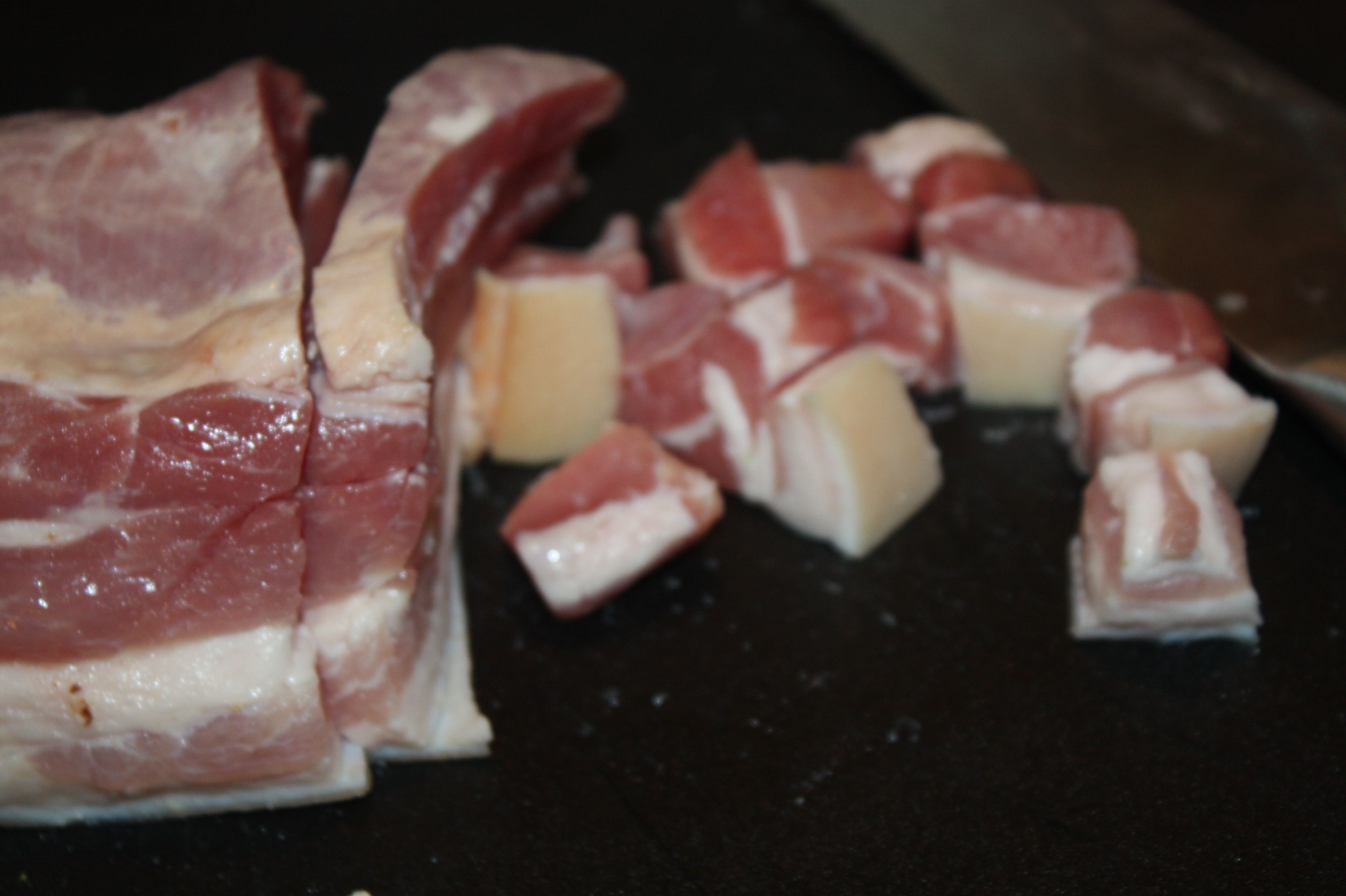 6. Kutt bacon i terninger, og fres i pannen sammen med brokkoli og blomkålbuktter.