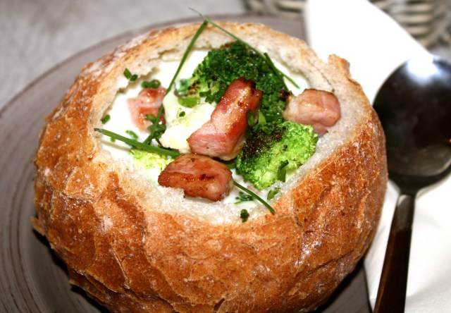 Server suppen i brødet. Pynt med brokkoli og blomkålbuketter. Jeg drysset over litt fersk gressløk også. Super godt 🙂