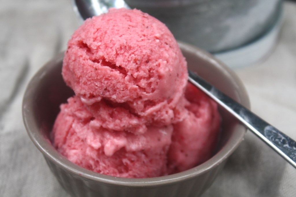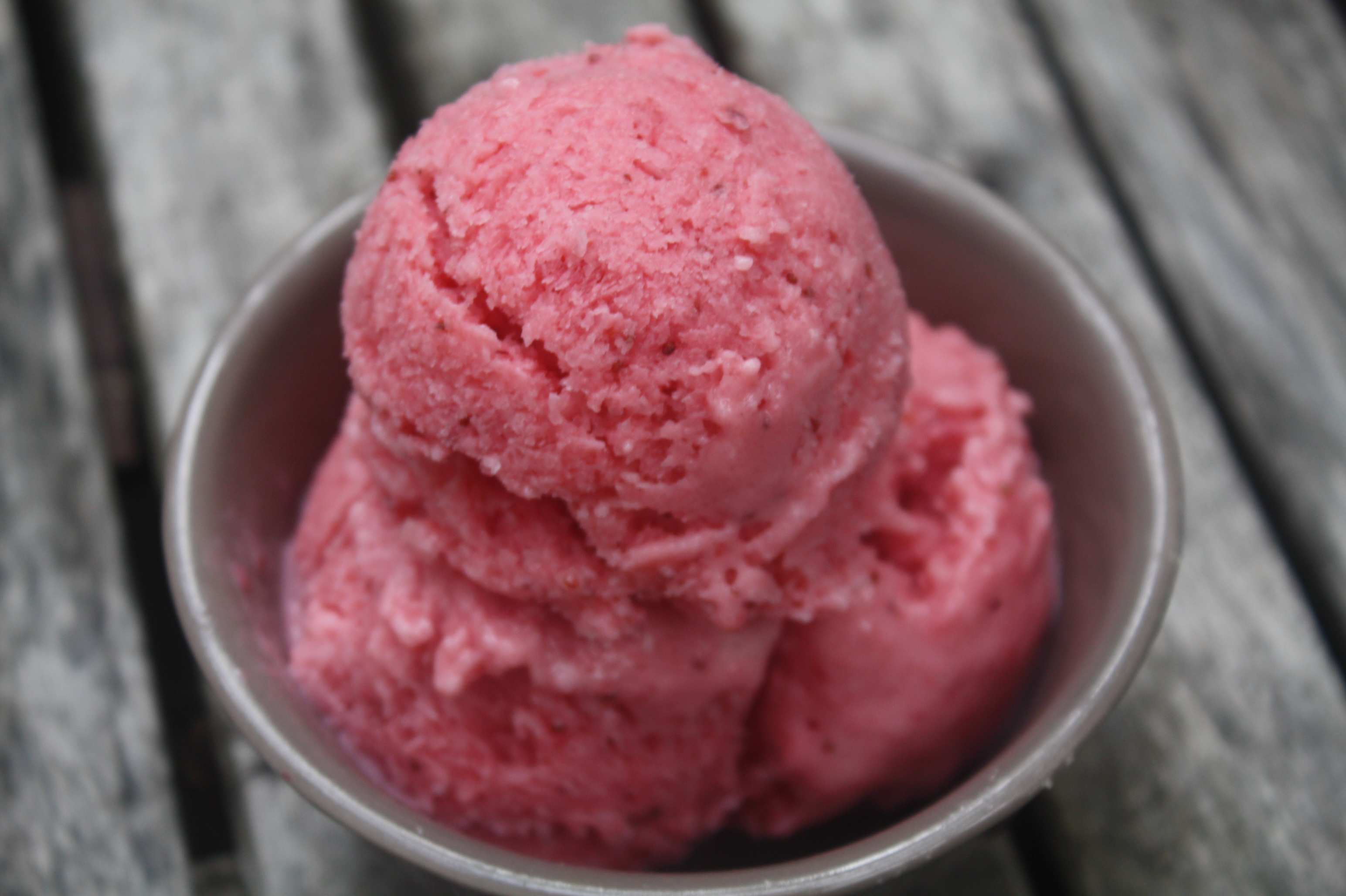 I går prøvde jeg meg på en litt sunnere variant av iskrem. Naturell yoghurt blandet med rørt jordbærsyltetøy. En kan for eksempel bruke noras rørte syltetøy, den finner du i de fleste frysedisker, eller en kan varme opp frosne bær sammen med sukker.