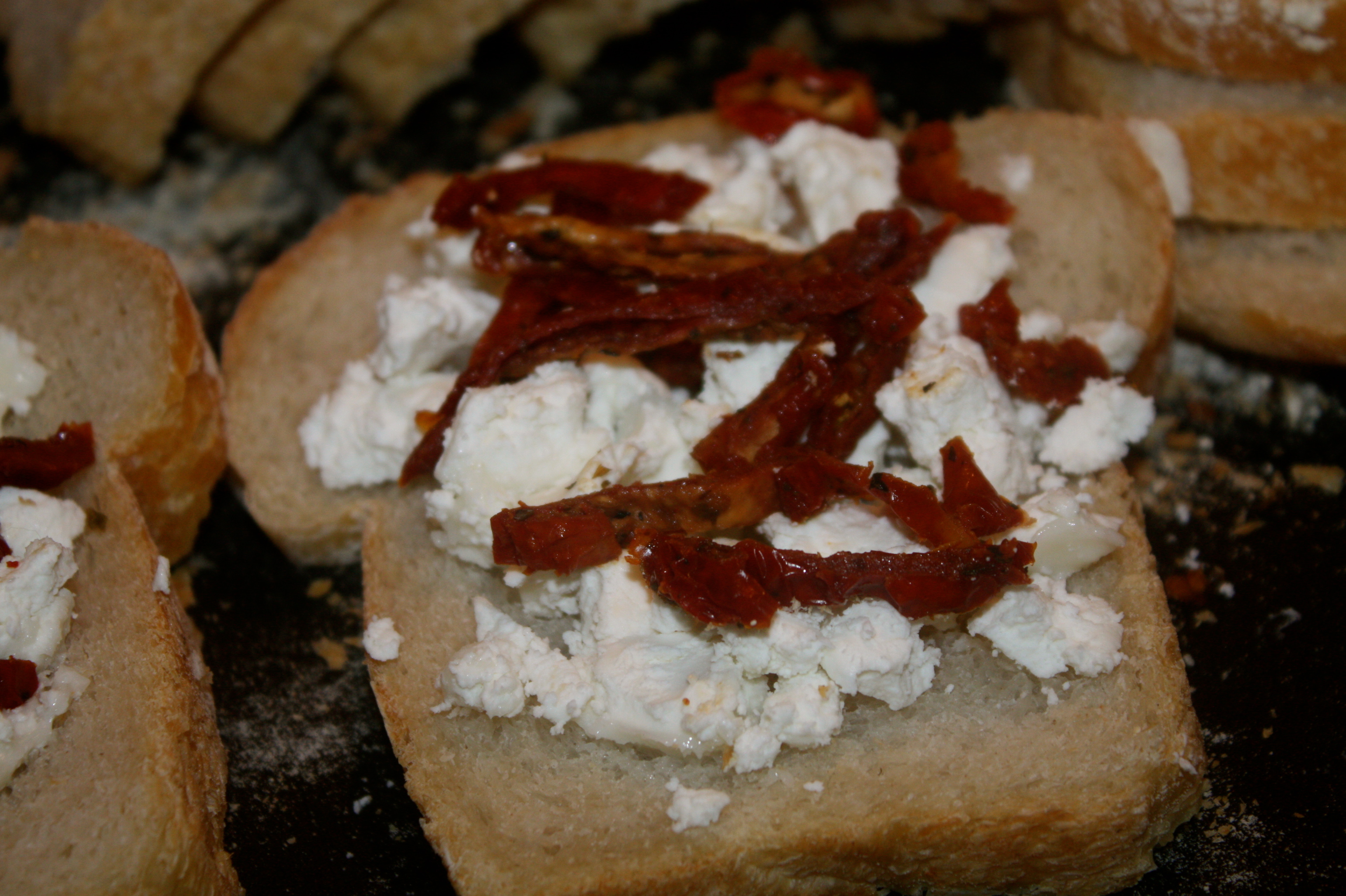 2. Fordel chevre og skivet soltørket tomater på to skiver loff.