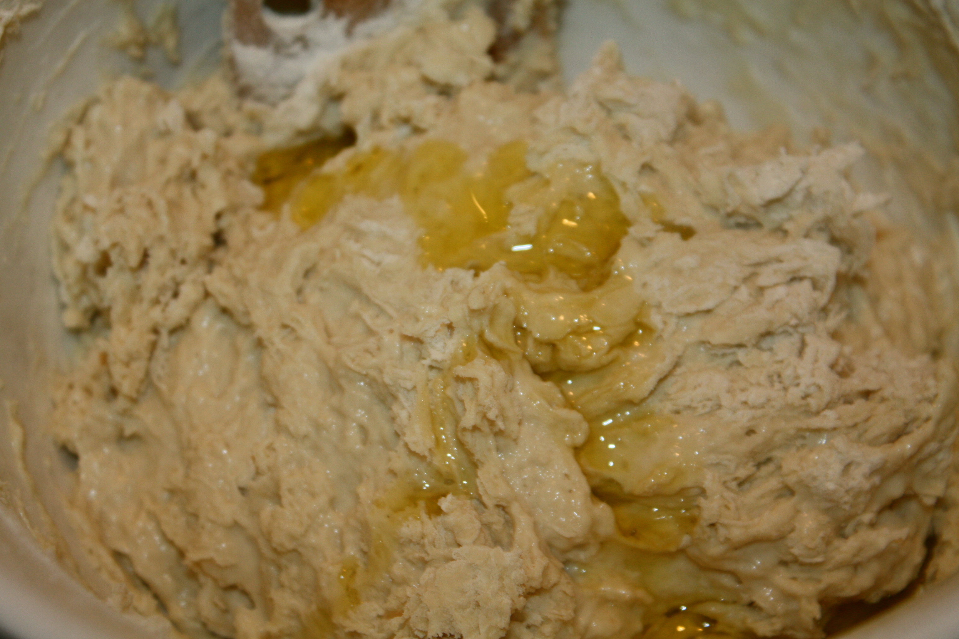 3. Tilsett oljen og bland videre. Om deigen er veldig klissete tilsett mer mel, og bruk hendene til å elte deigen.