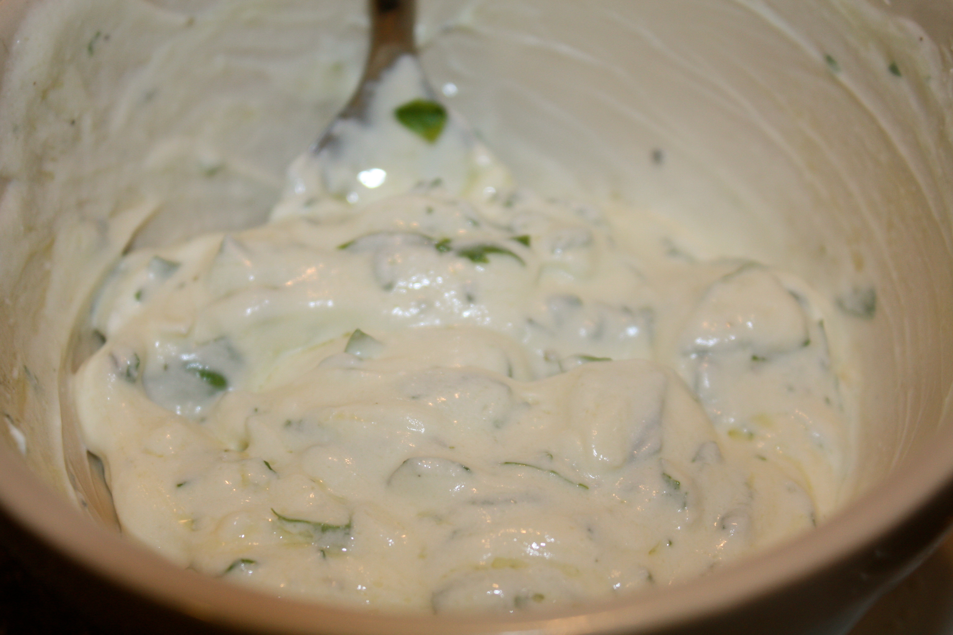 7. Mens pizzadeigen heves, bland sammen den hvite grunnsausen.