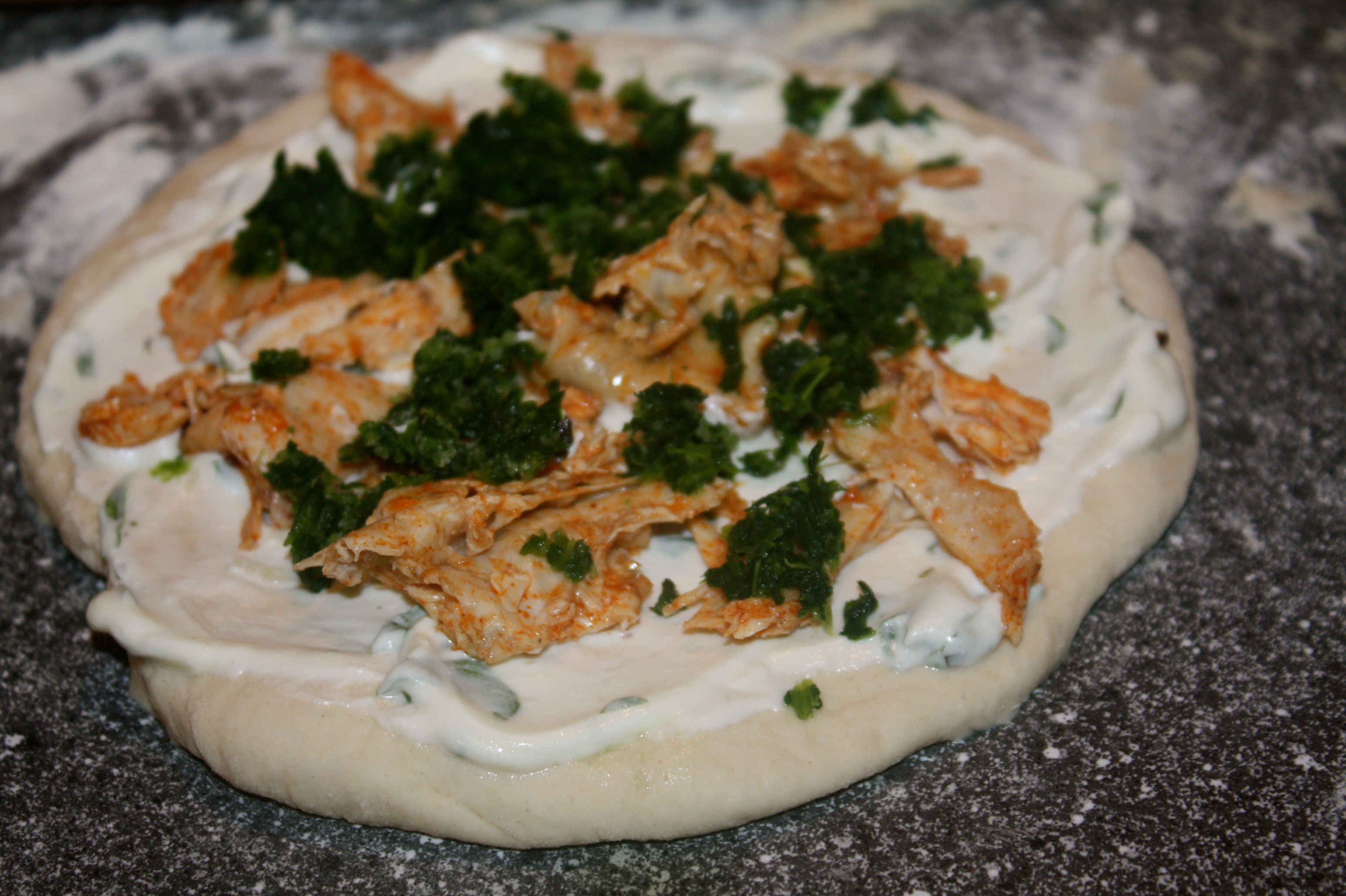 9. Legg på pizzasaus, deretter kylling og spinat. Husk å klemme ut vannet av spinaten, om du bruker fryst spinat.