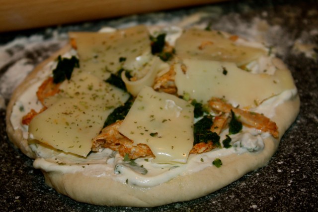 Jeg kyllingrester fra den ovnsbakte kyllingen jeg laget på søndag, dermed laget jeg kylling og spinat pizza. Smakte fantastisk sammen med hvit pizzasaus, min nye favoritt. Om du er litt lei av den røde pizzasausen anbefaler jeg deg å prøve ut denne.