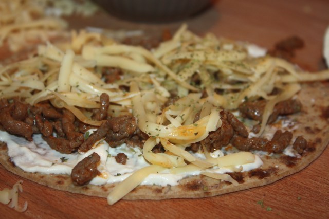 1. Smør bunnen med creme fraiche blandet med revet hvitløk. Strø over kjøttet, ost og krydder. Stek på 200 grader- 8-10 min.