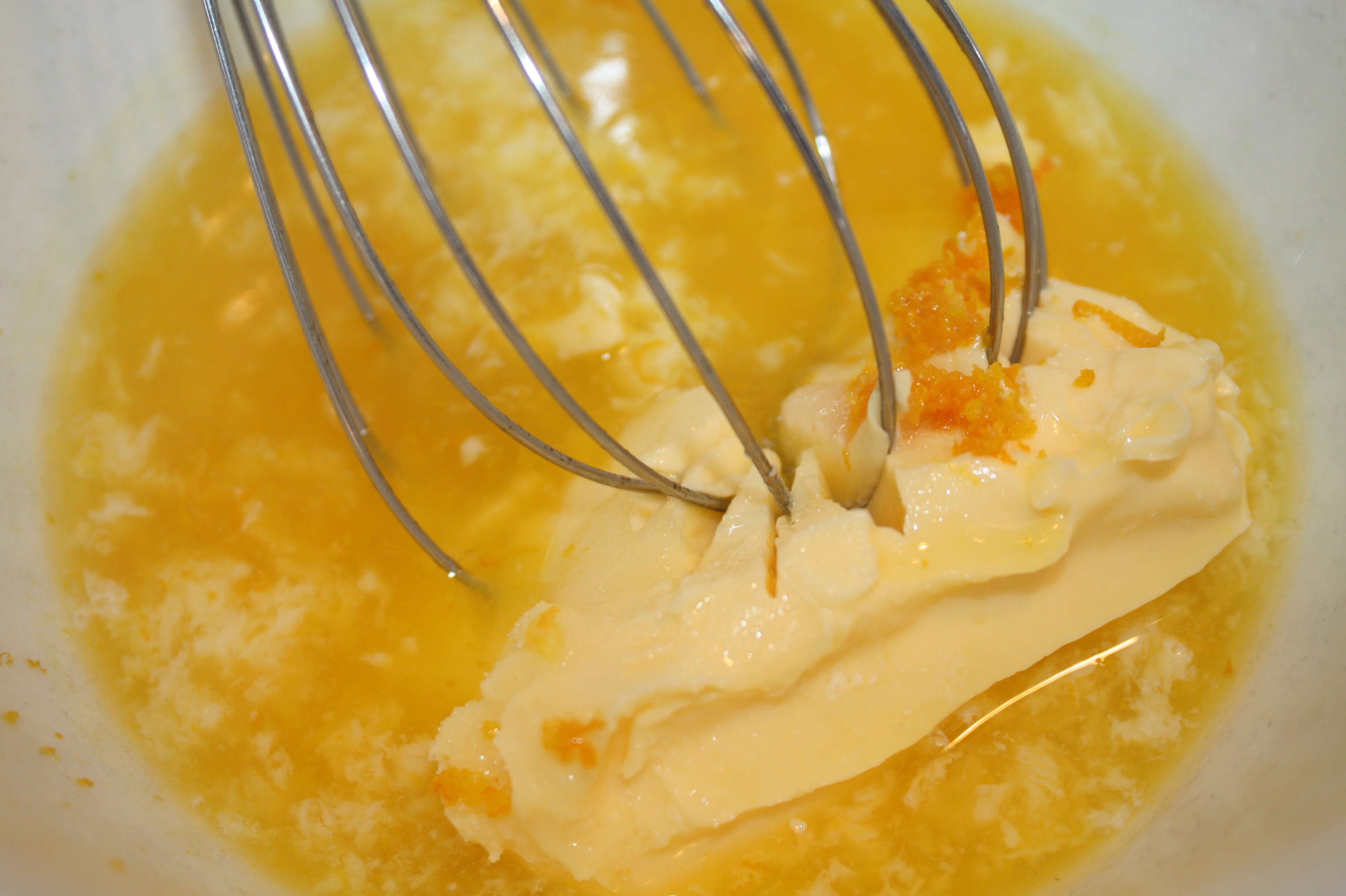 2. Bland sammen smør, sukker, apppelsinjuice, melk og raspet appelsinskall i en egen bolle.