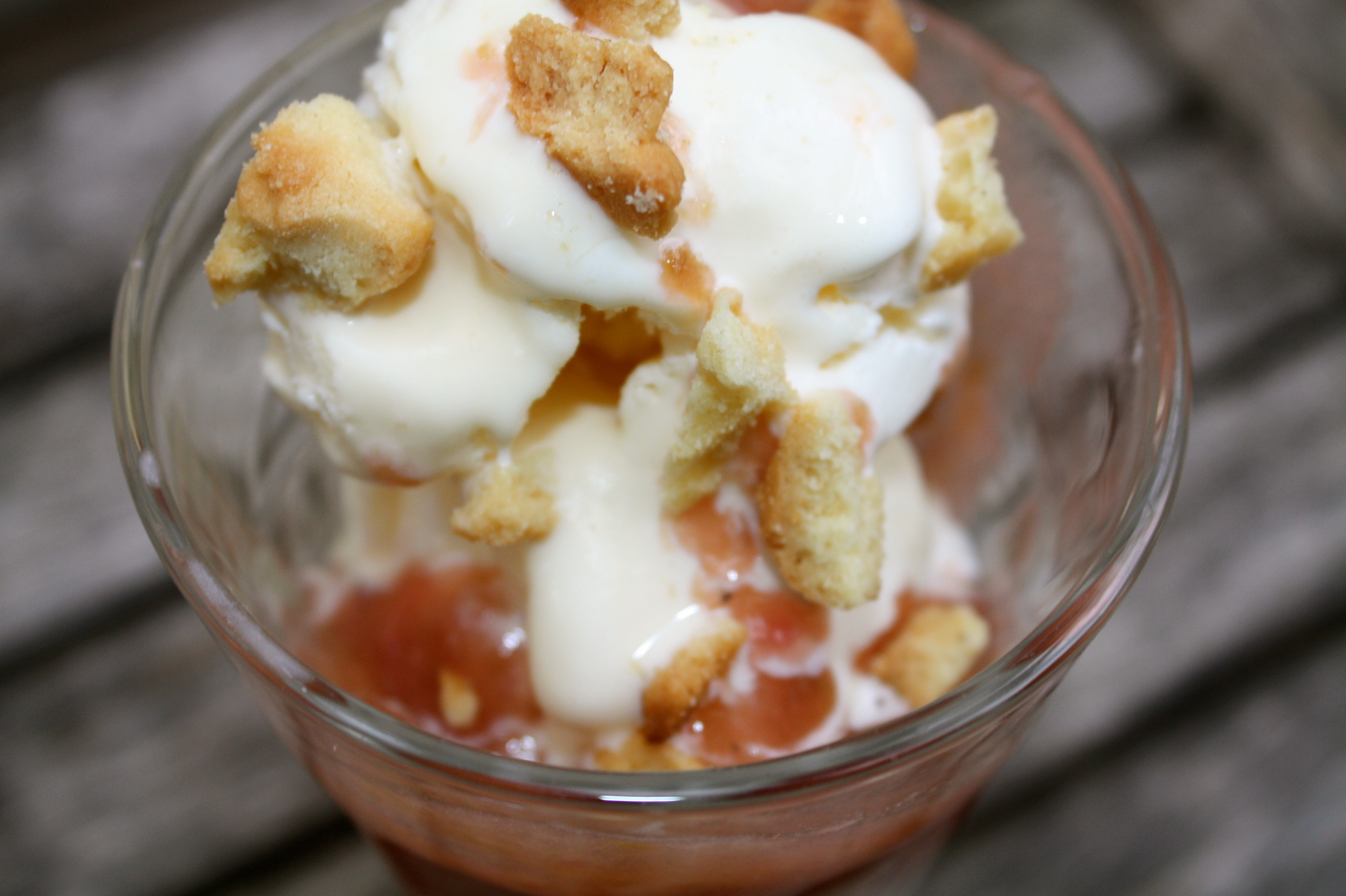 Server med vaniljeiskrem. Jeg hadde noen rester av en tertedeig jeg strødde over. Himmelsk!