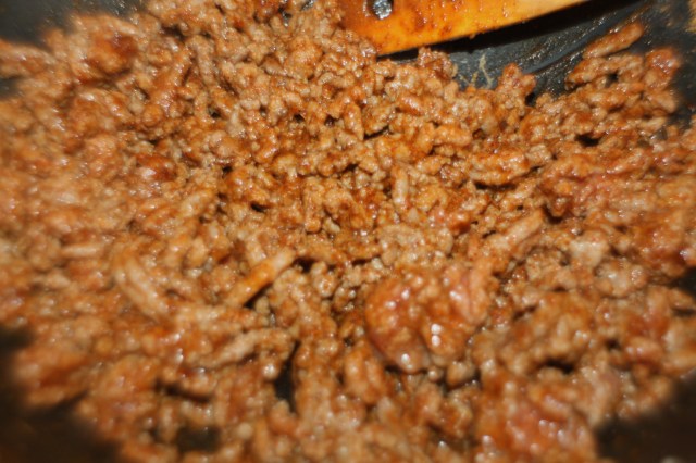 1. Stek karbonadekjøttet og tilsett tacokrydder.