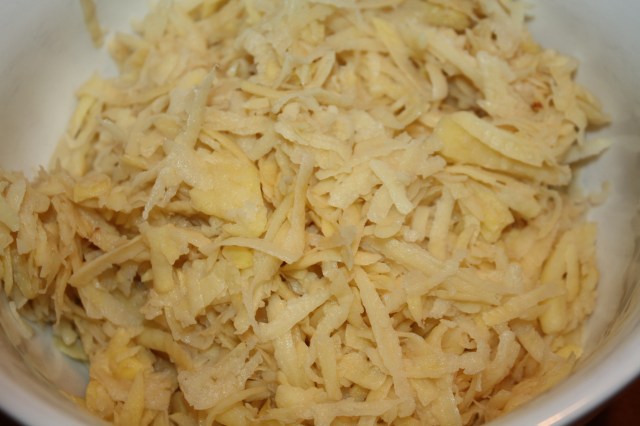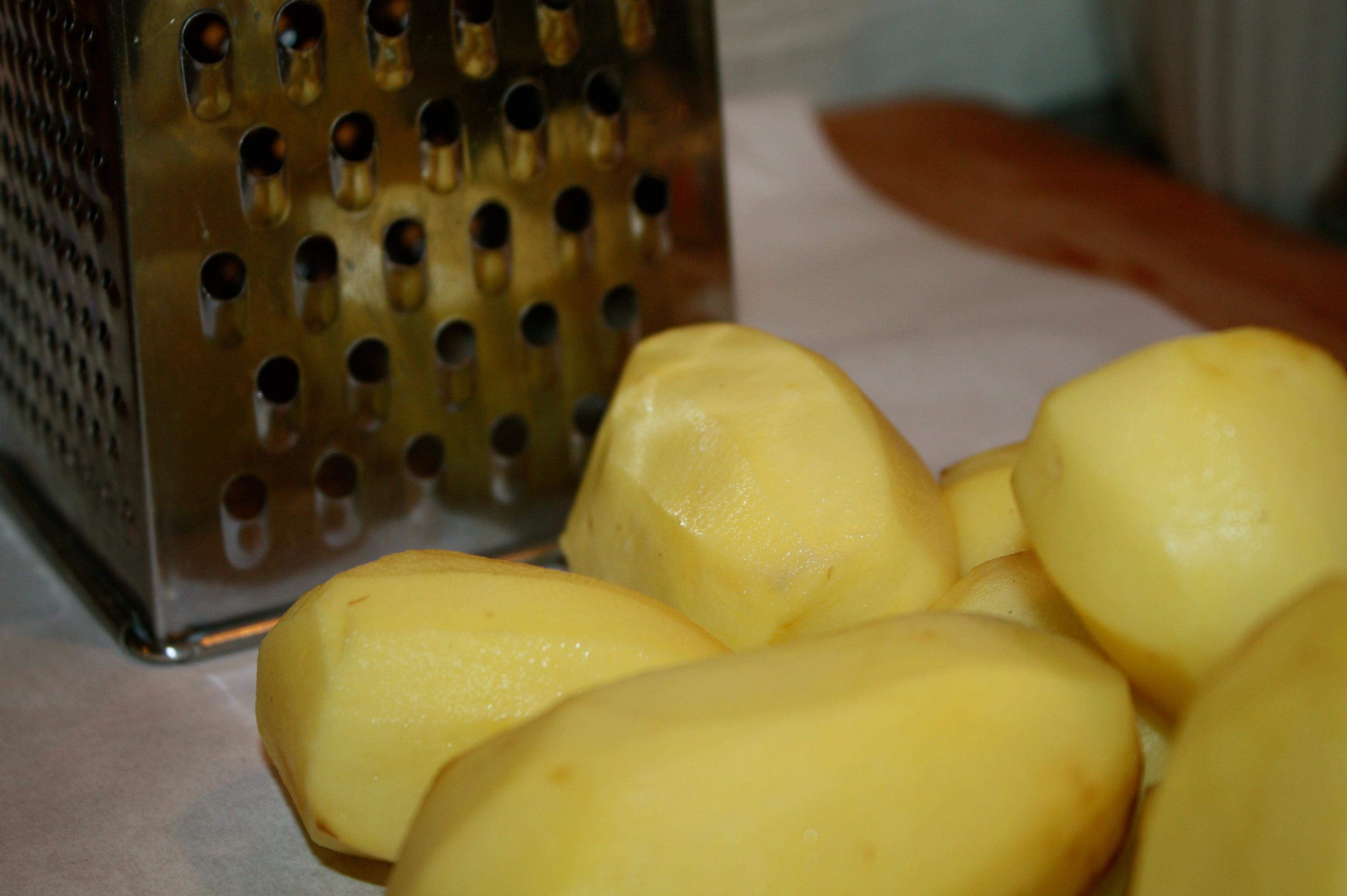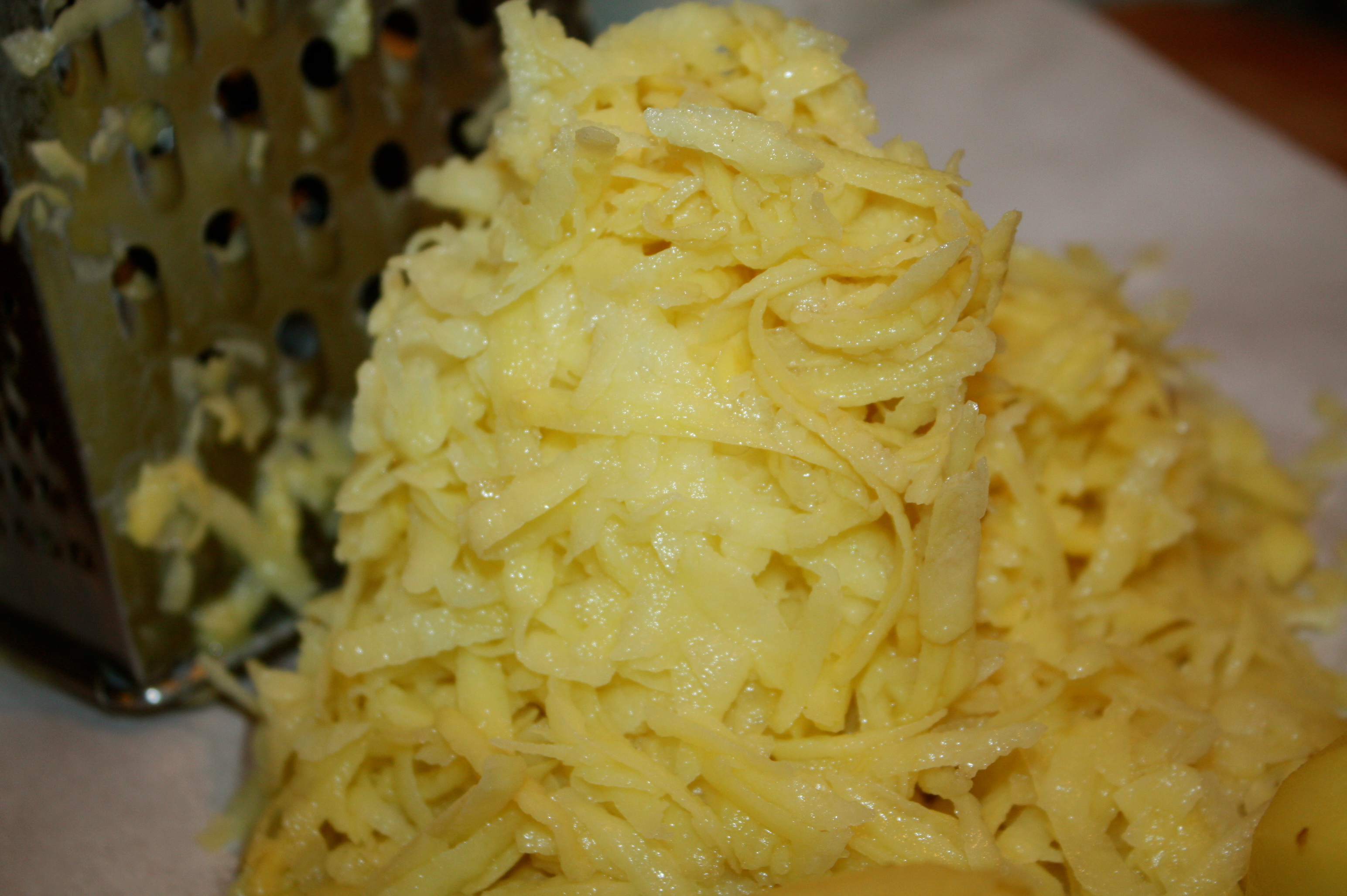 Legg revet potet i en kjøkkenhåndkle og press ut vannet. Legg deretter alt i en stor bolle.