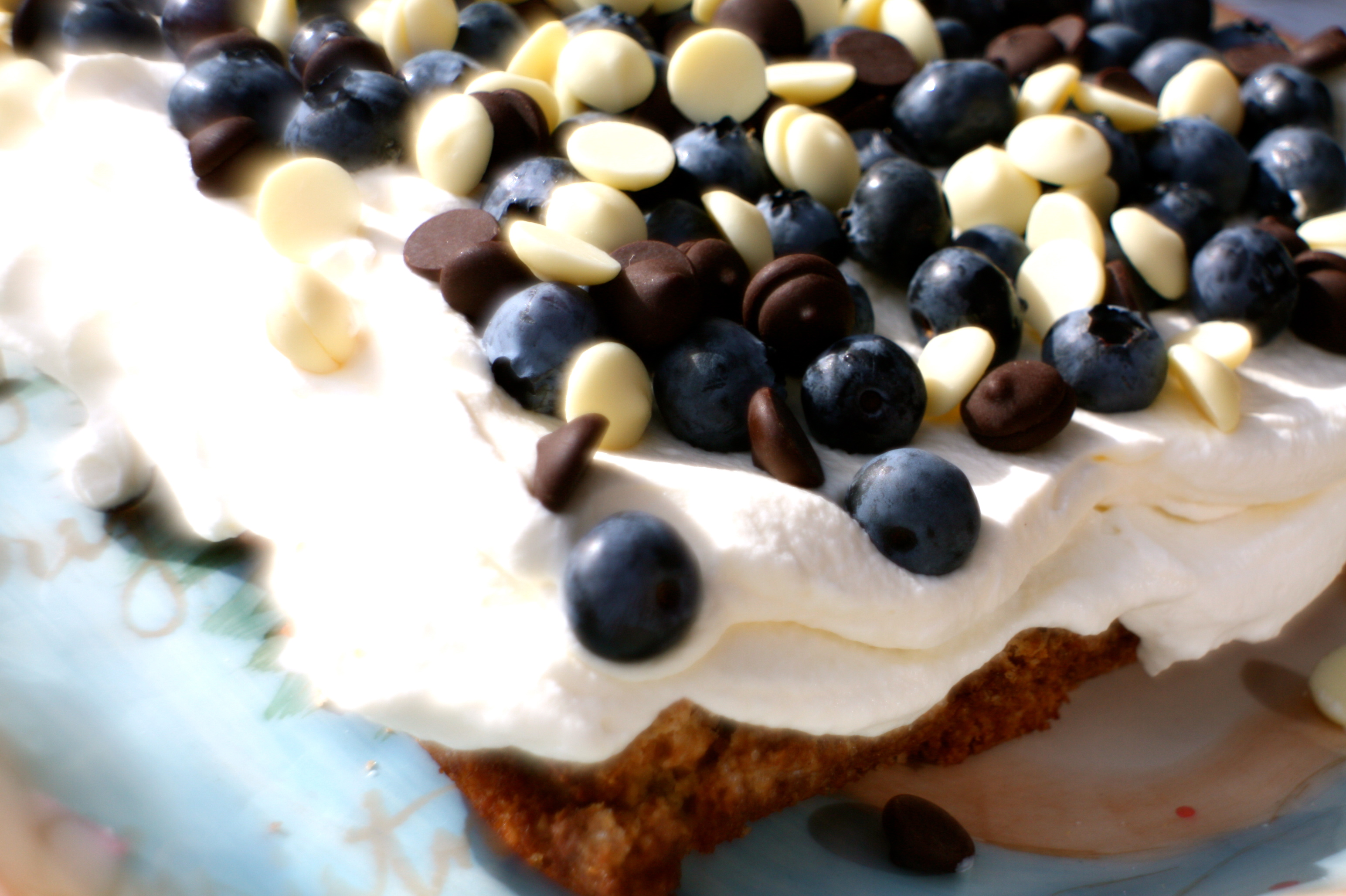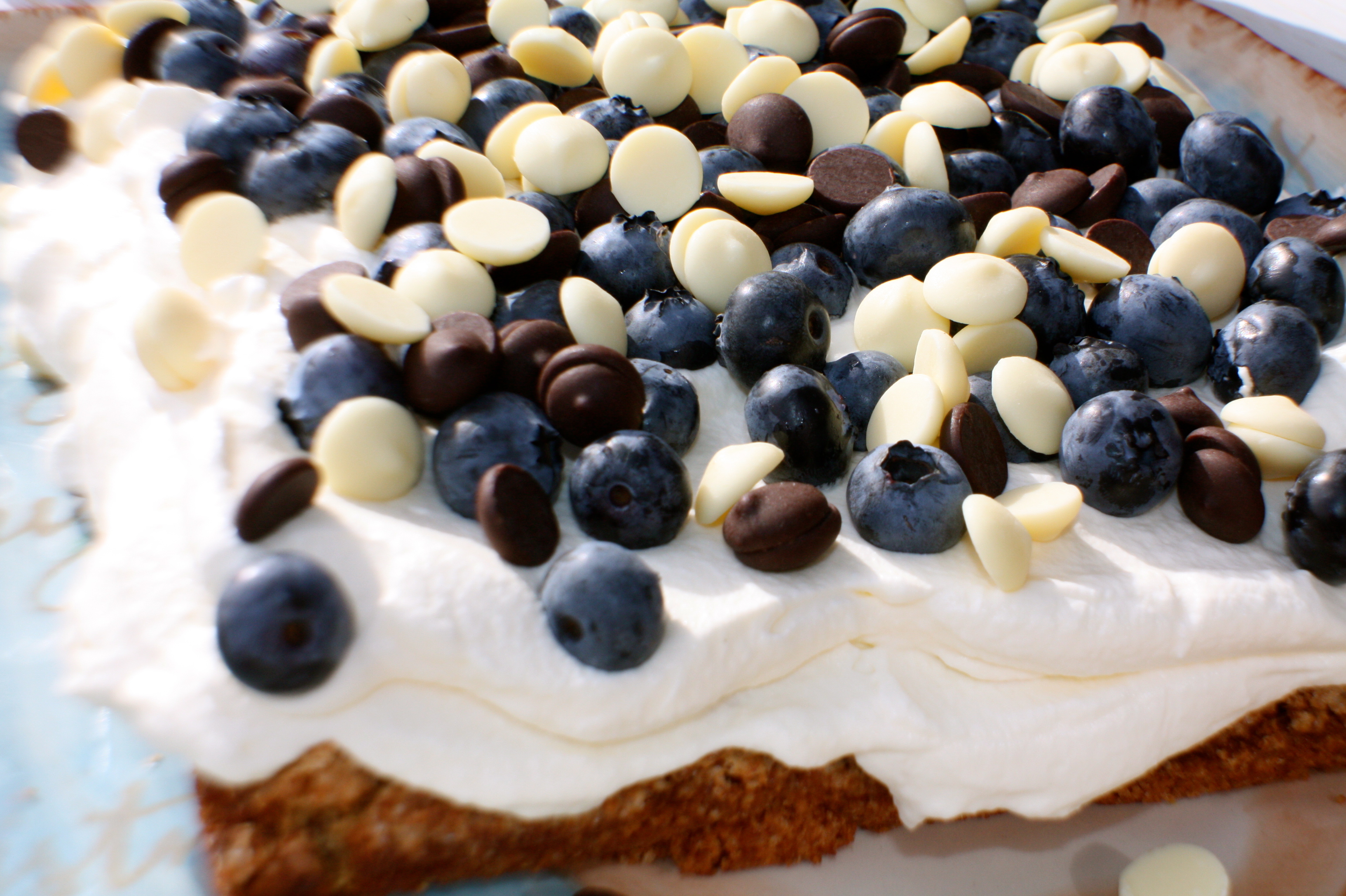 Pisk kremfløte. Legg krem over kaken, og strø over blåbær og sjokoladeknapper.