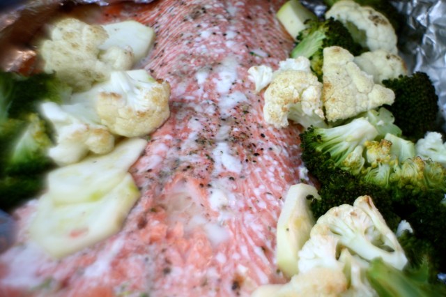 3. Legg grønnsaker langs fisken. Jeg hadde brokkoli, blomkål og squash. Stek på 200 grader ca. 25-30 min.