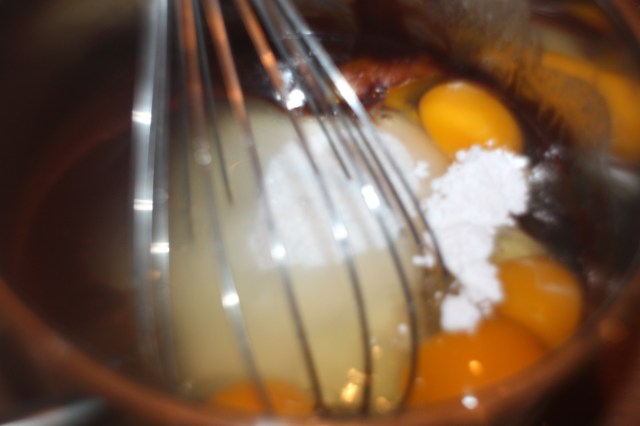 3. Jeg bruker å blande alt i kjelen. Tilsett egg, sukker og vaniljesukker.
