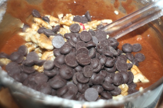 5. Bland inn grovhakket valnøtter og sjokoladeknapper med en slikkepott.