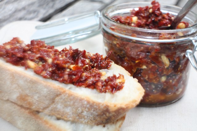 I går laget jeg rød pesto som tilbehør til middag. Smaker ypperlig på godt brød, i pastaretter og til tapas. Enkelt og fort å lage. Ekstra fint å legge pestoen i fine glass og gi vekk i gaver til venner.