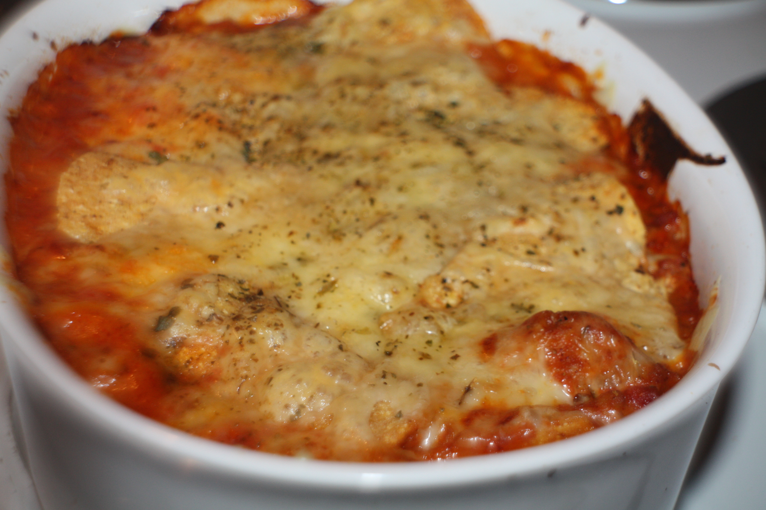 7. Ha over revet ost og krydder. Stek i ovene på 200 grader i ca.20-30 min. Osten skal være gyllen på toppen.
