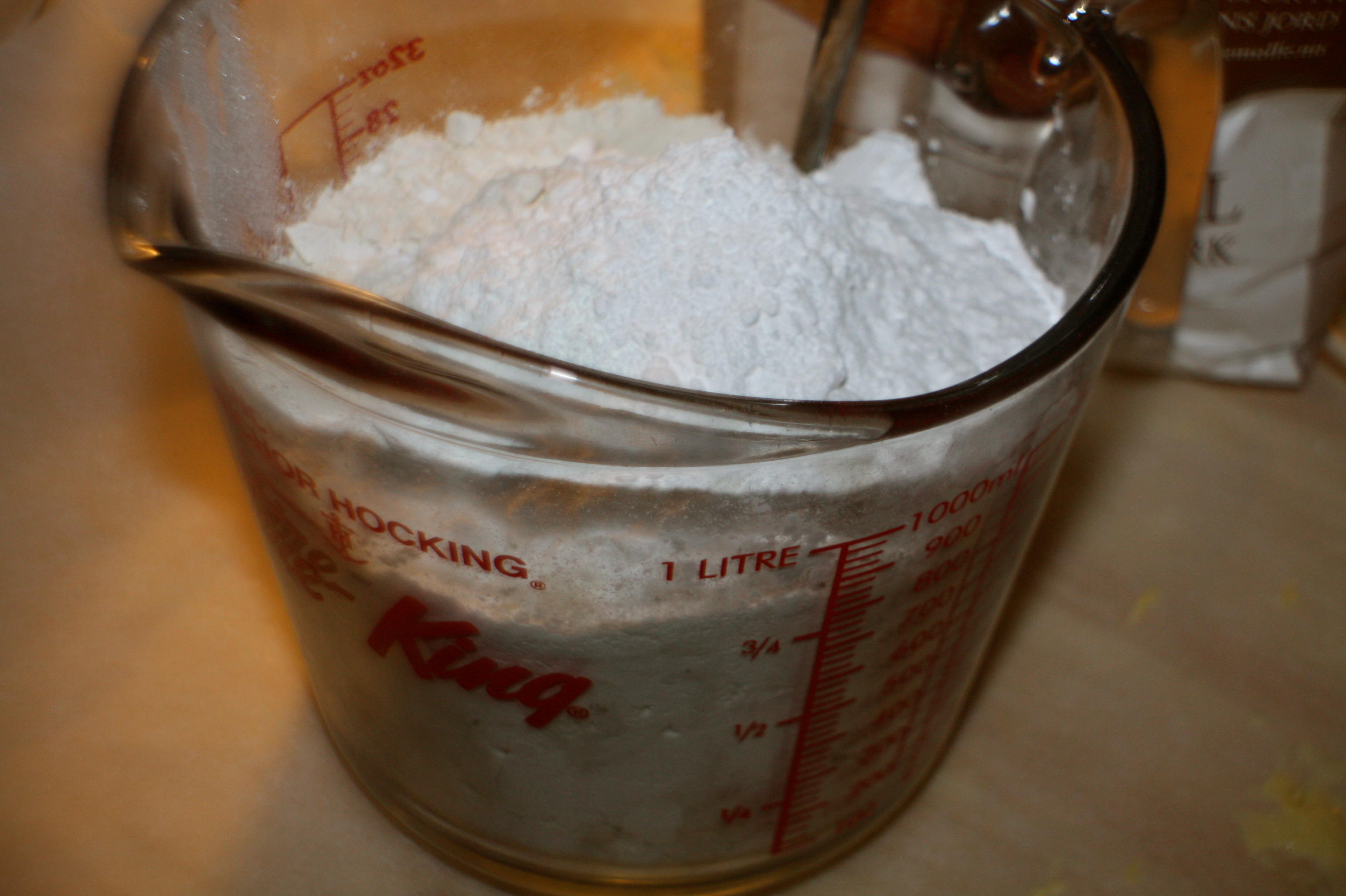 3. Bland hvetemel, bakepulver og vaniljesukker i en egen bolle. Bland godt.