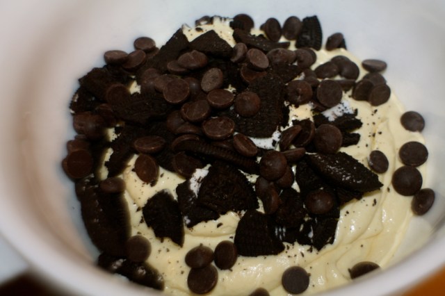 Knus resten av oreokjeksene og ha det i røren, sammen med chocolatechips. Rør med en slikkepott.