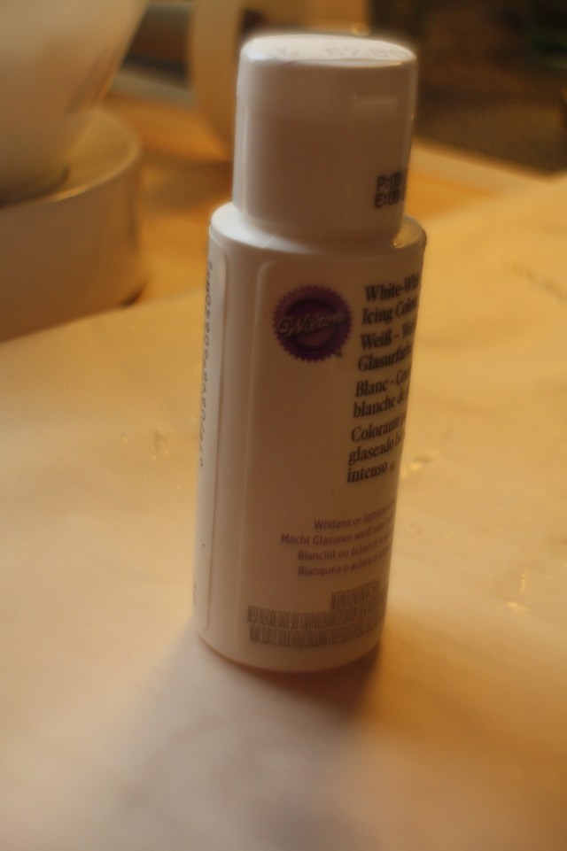 Tilsett extra white fra wilton, slik at du får en fin og ren hvitfarge på frostingen.