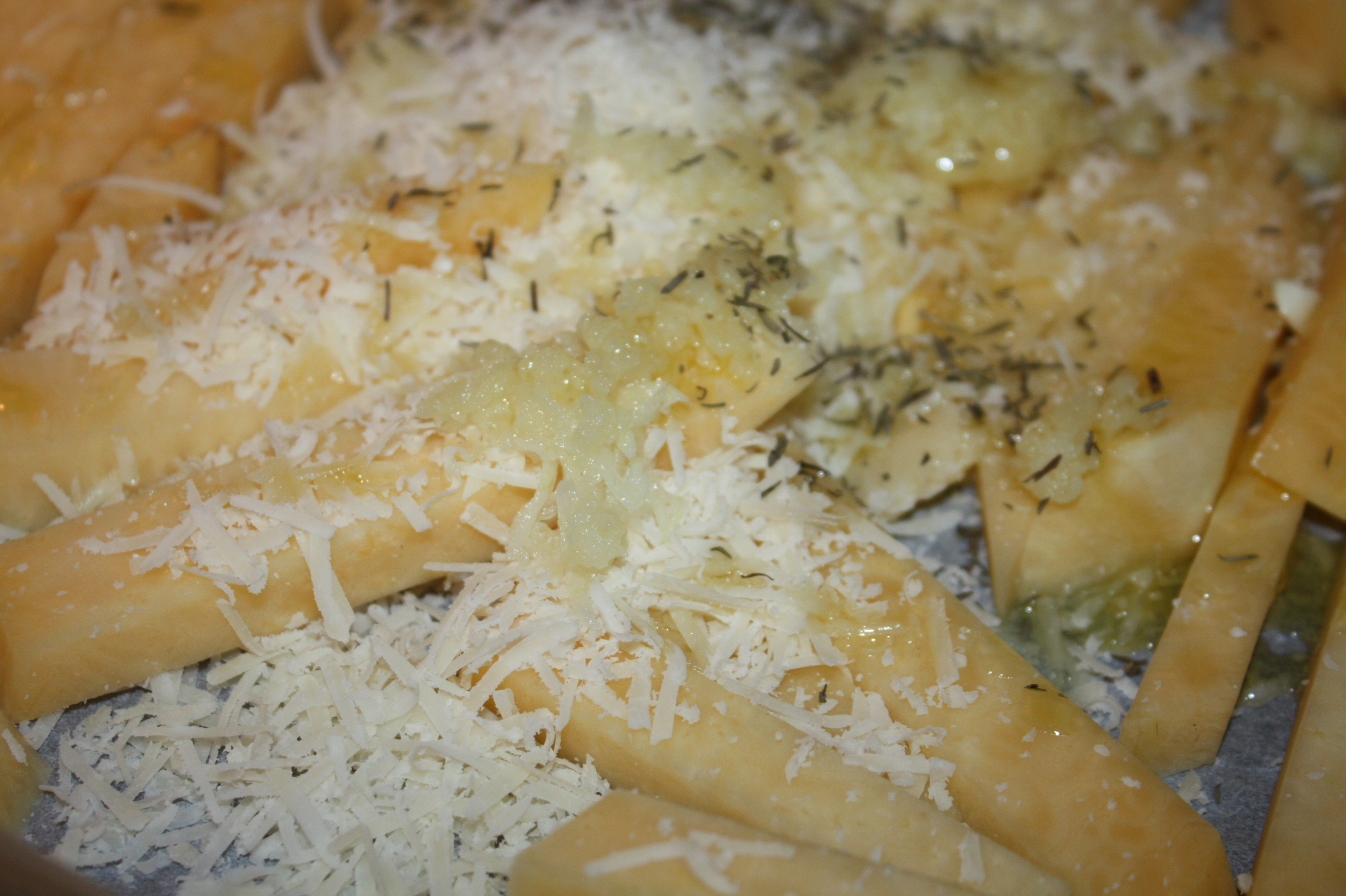 3. Ha bakepapir i en langpanne. Legg kålrot frisene i pannen. Rasp over revet parmesan, hvitløk og salt, pepper og rosmarin. Jeg hadde en god del olje over. Jeg blandet alt med hendene, slik at hver fries skulle bli godt dekket.