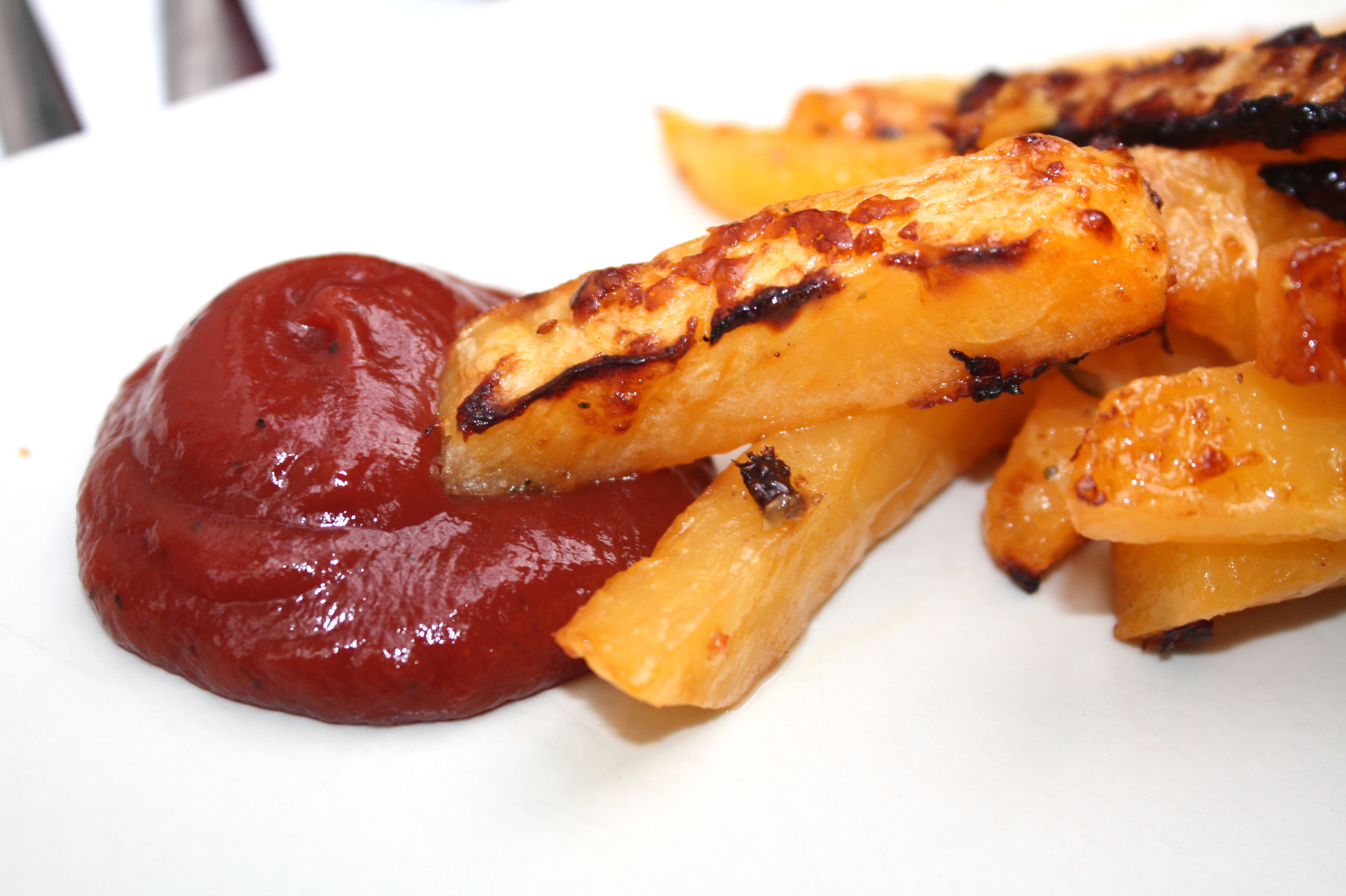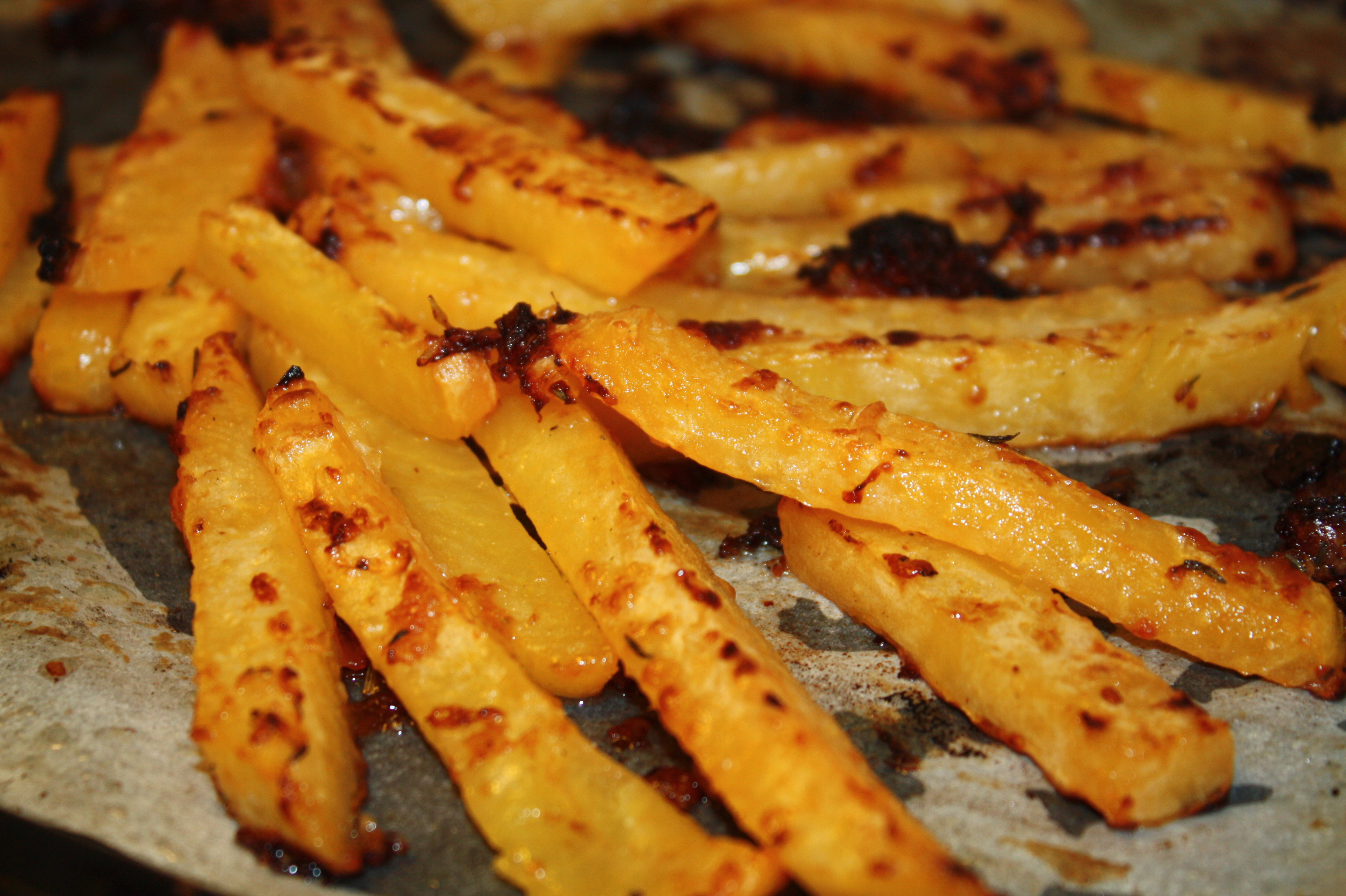 Kålrotfrisene får en fin og gylden farge når de kommer ut av ovnen.