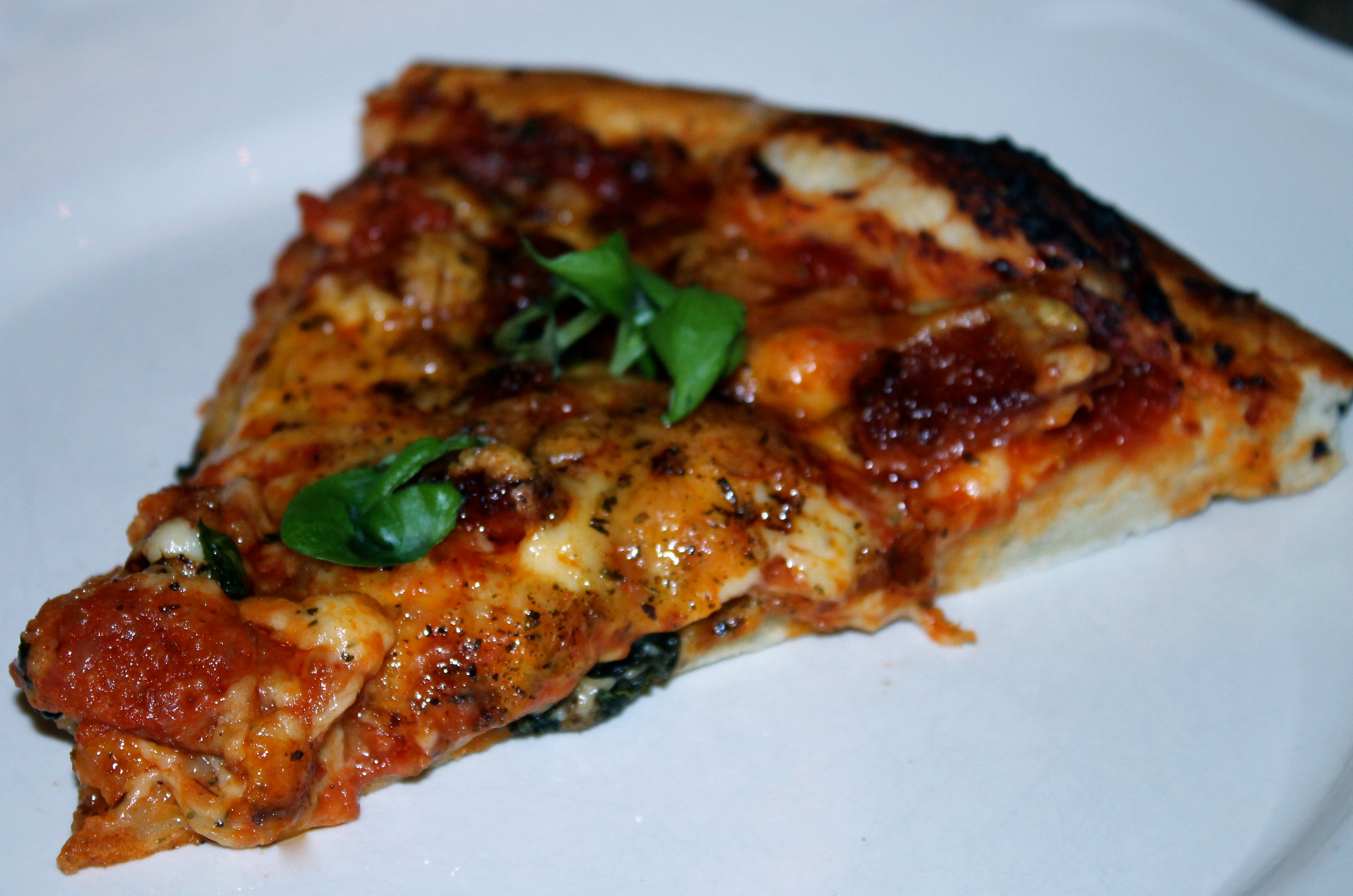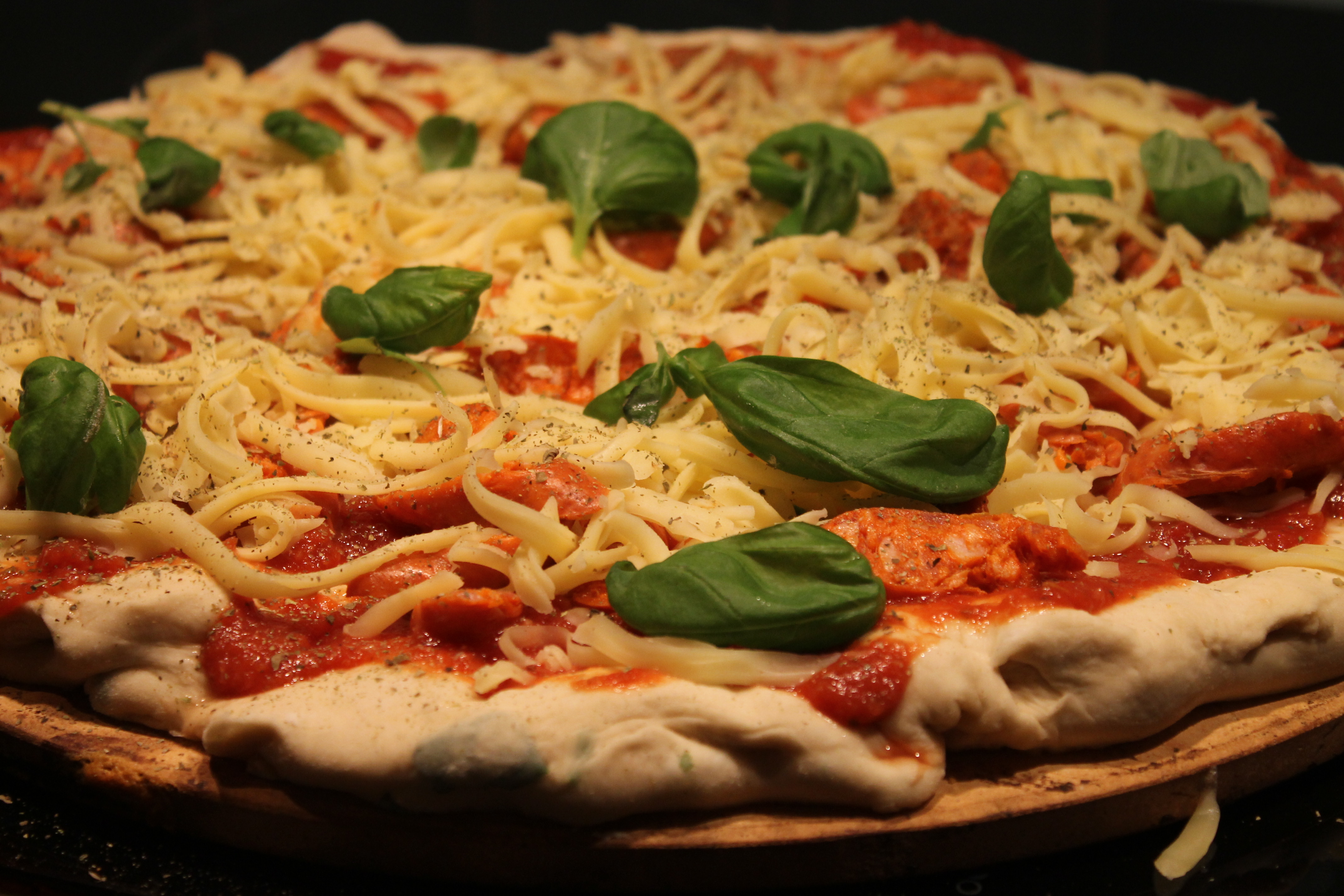 Når du setter på ovnen, ha isteinovsplaten. Den skal være glovarm når du legger på deigen. Ha deretter på tomatsaus, fyll, ost, frisk basilikum og pizzakrydder.Stek på 250 grader i ca.8-10 min.