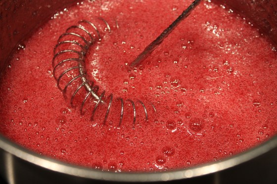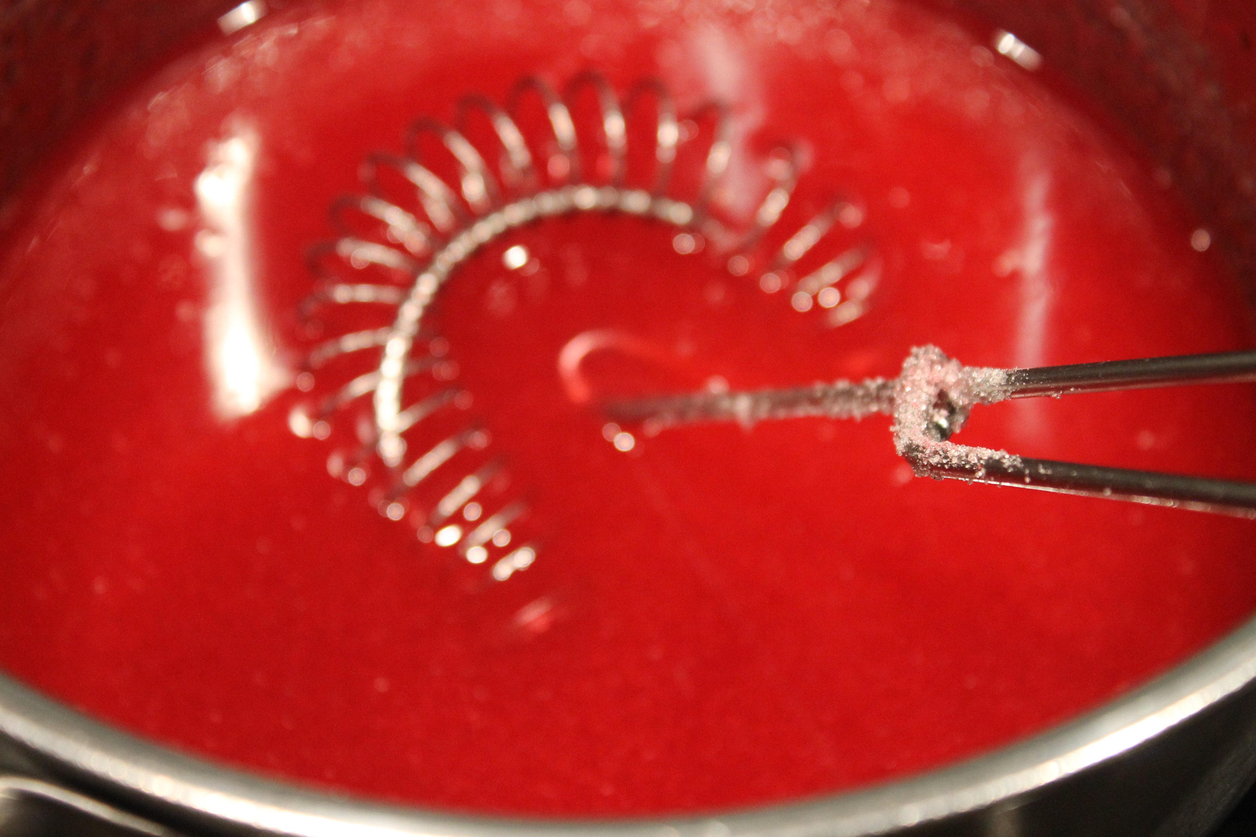3. Når sukkert har smeltet, ta kjelen av platen og tilsett gelepulver. Rør godt. Klem deretter ut vannet av geleantinplatene og tilsett i røren. Rør til det blir en klumpfri røe.