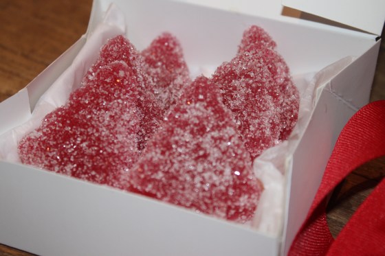 Superfine geletrær. Ha gelen i fine gaveesker og ha rødt bånd rundt.