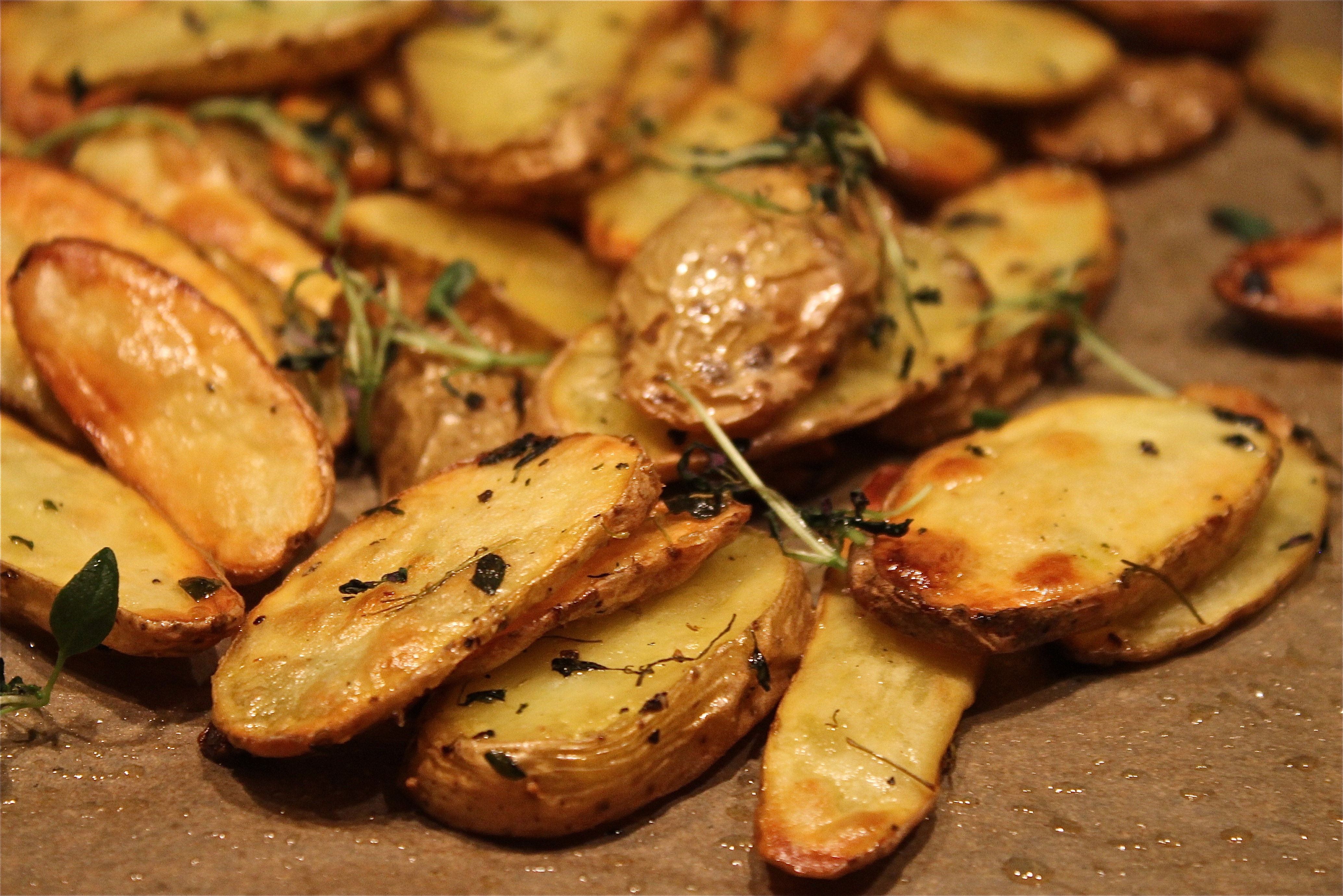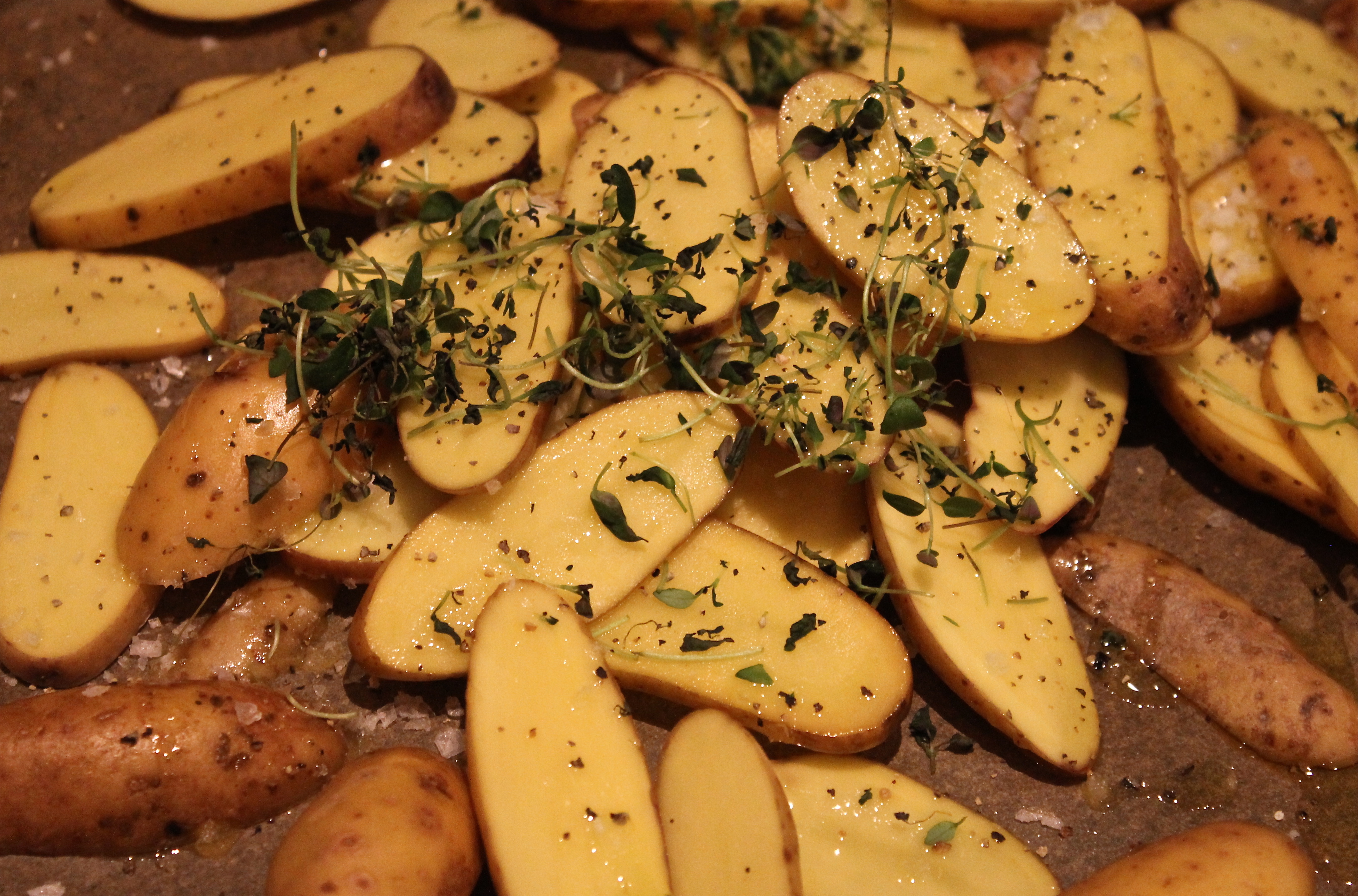 1. Sett oven på 200 grader. Vask og skjær potene i tynne skiver. Ha godt med olje over, og bland sammen med timian og salt.