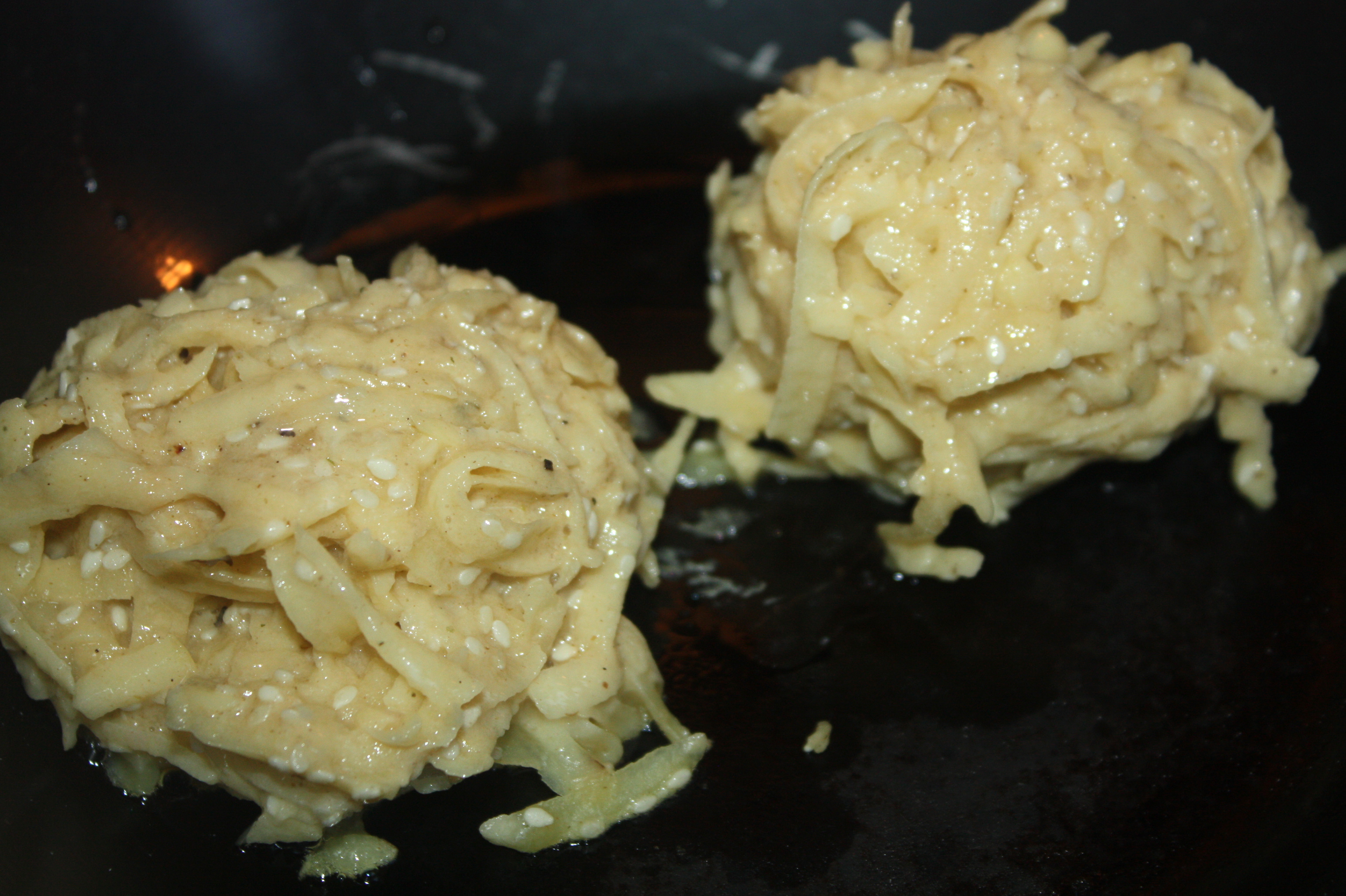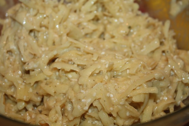 2. Bland inn mel, krydder, egg og sesamfrø. Bland godt.