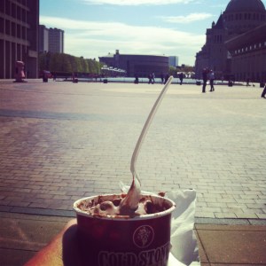 iskrem fra coldstone. Du velger iskrem, så tar de å hakker den på en kaldplate, og så adder du toppings, så mikser de den sammen på nytt. the best!