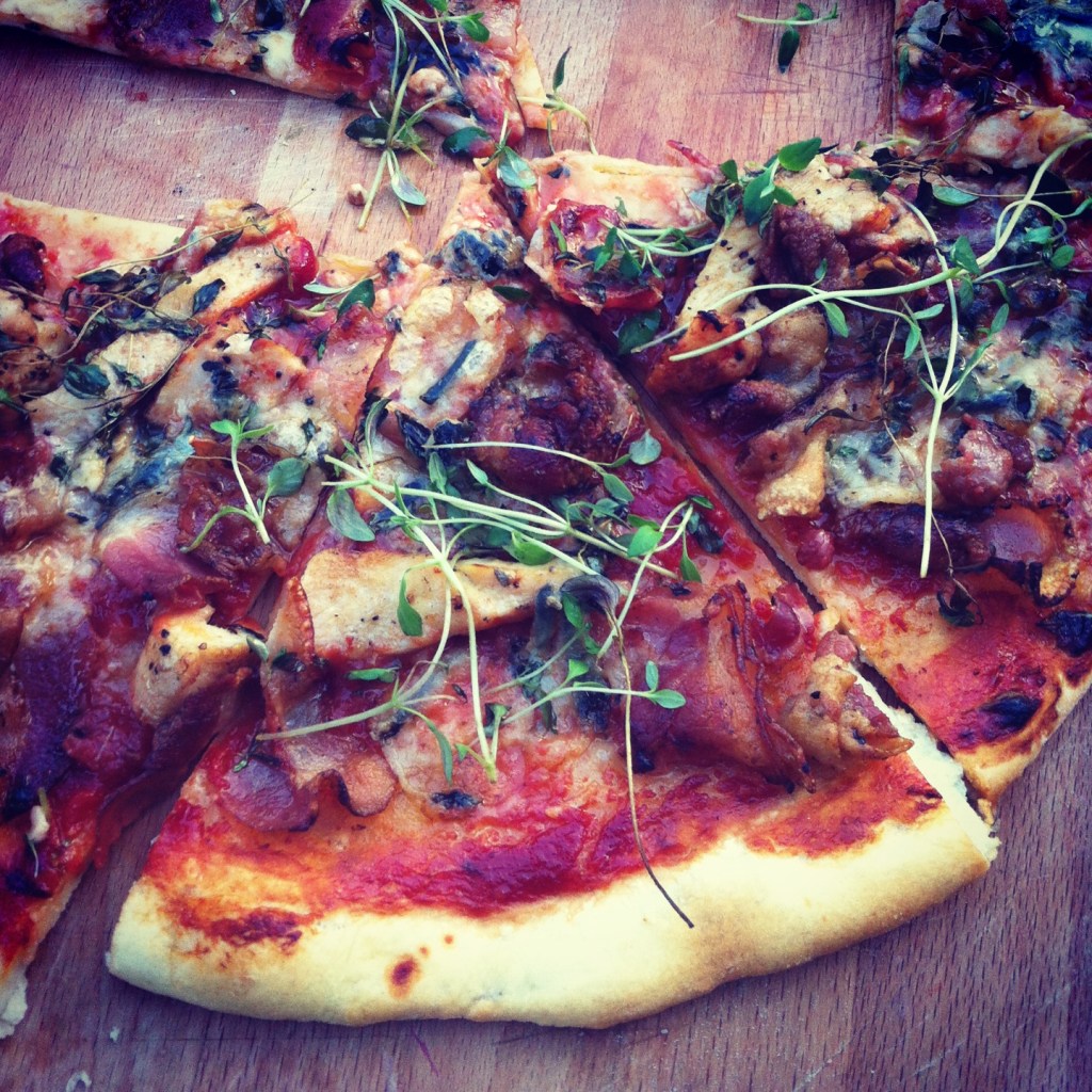 3. Legg pizzadeigen på den glovarme steinovsplaten. Ha over fyll, og stek i ca. 10 min( kommer an på hvor stor størrelse du har på din pizza). Jeg fylte min pizza med strimlet kyllinfilet, bacon, frisk timian, pizzasaus og blåmuggost.