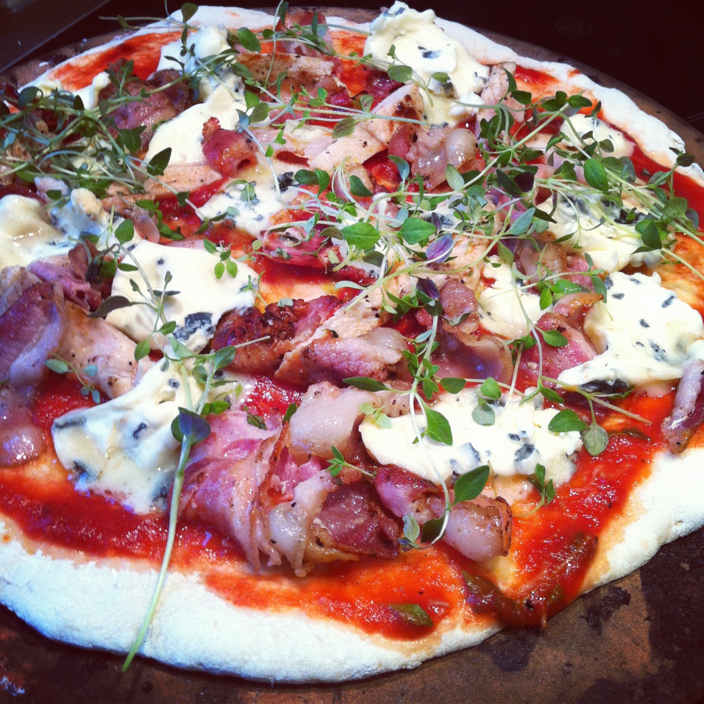 3. Legg pizzadeigen på den glovarme steinovsplaten. Ha over fyll, og stek i ca. 10 min( kommer an på hvor stor størrelse du har på din pizza). Jeg fylte min pizza med strimlet kyllinfilet, bacon, frisk timian, pizzasaus og blåmuggost.