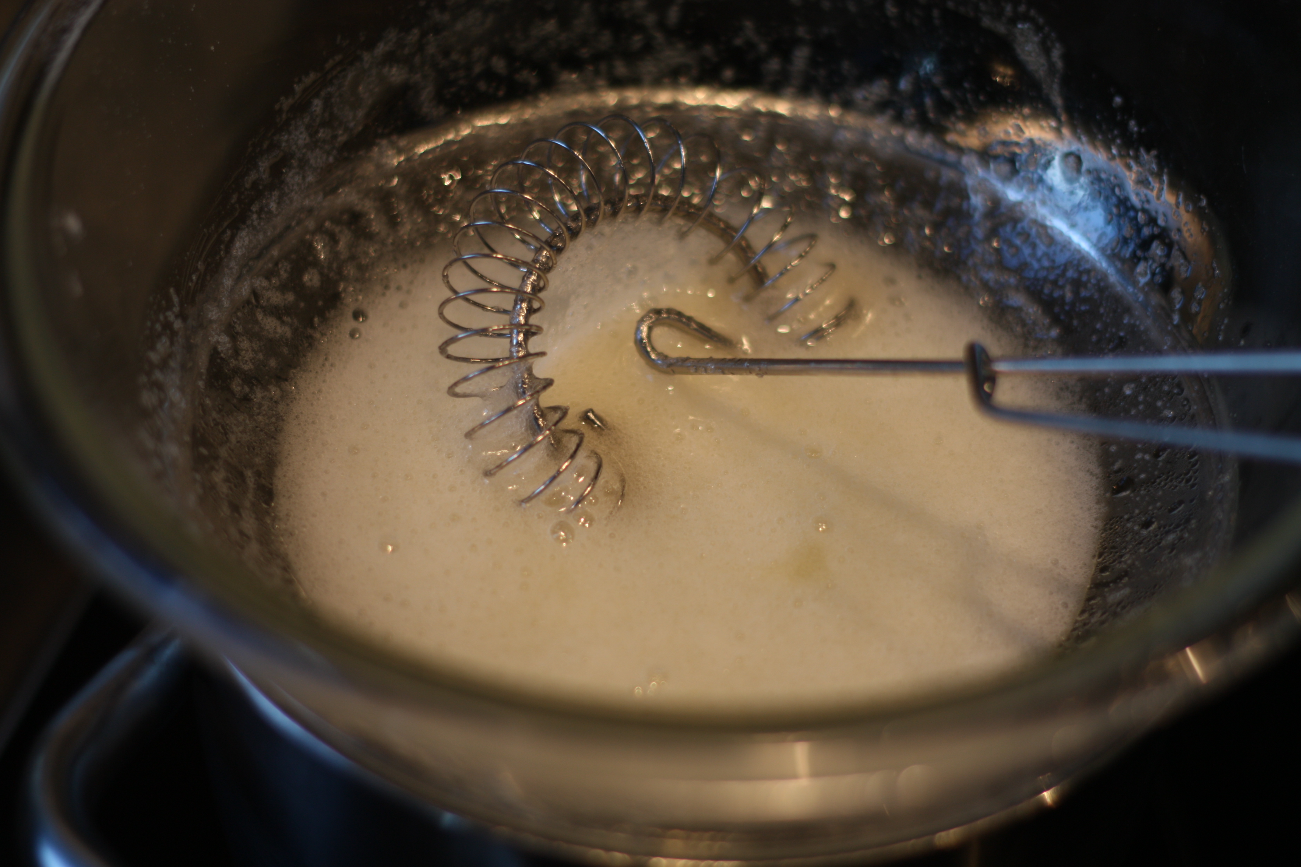 1. Pisk sammen sukker og eggehviter i en glassbolle over vannbad.