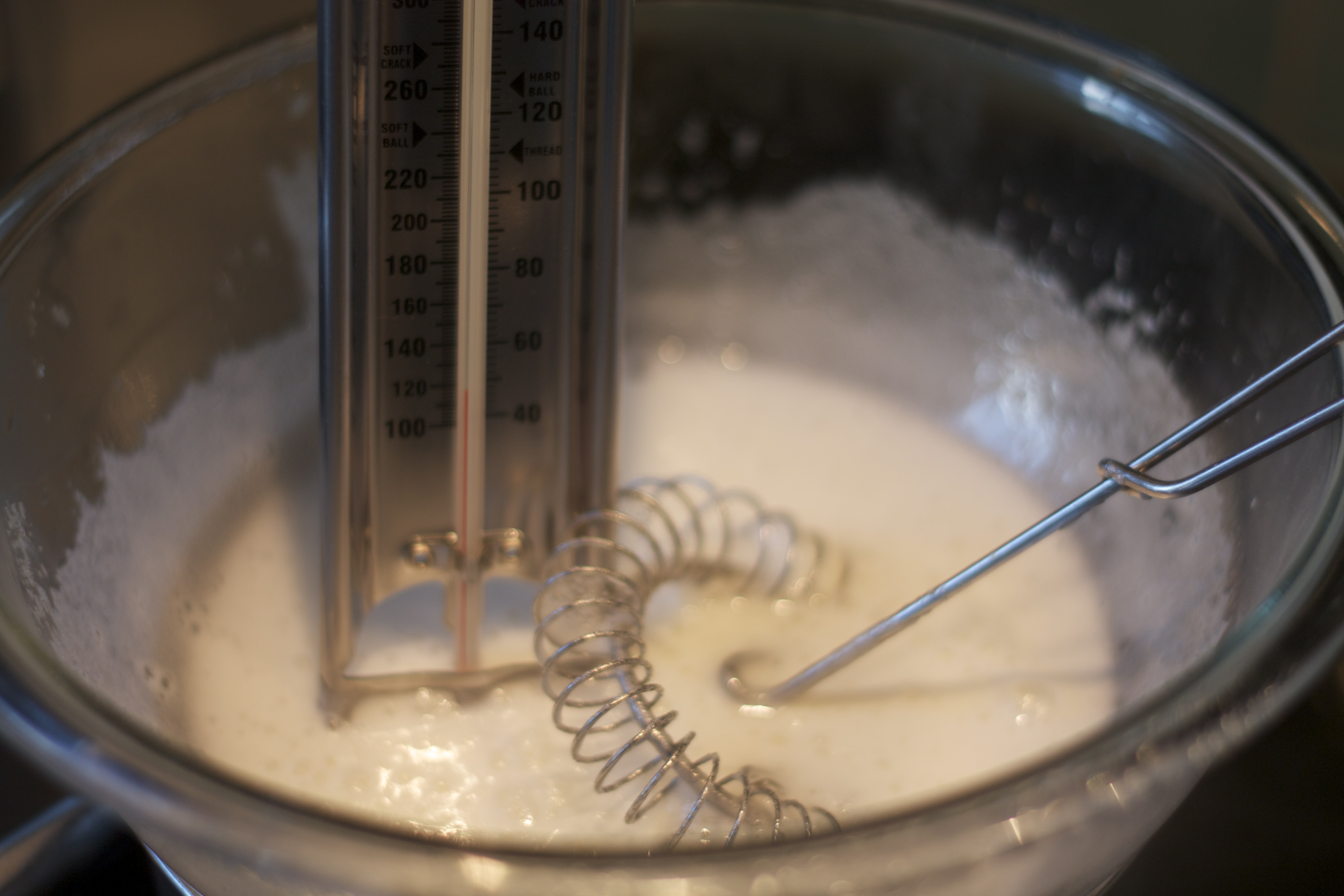 2. Pisk til den når 60 grader. Ta deretter bollen av kjelen, og pisk med en håndmikser til marengsen er tykk. Du skal kunne løfte bollen opp-ned, og bollen skal være romtemperatur.