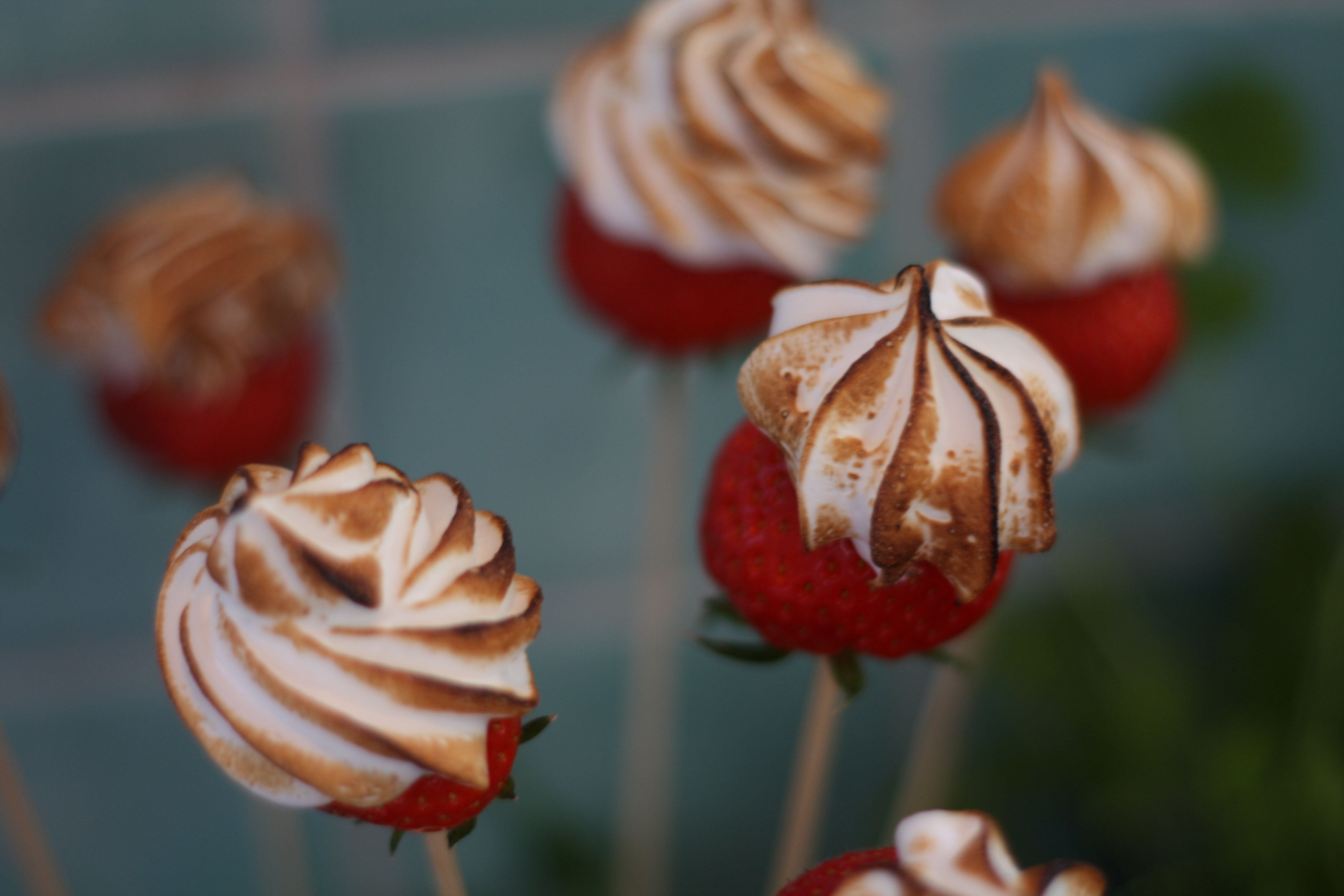 3. Ha marengsen i en sprøytepose med tipp, og sprøyt rundt jordbærene. Bruk deretter brenner og brenn marengsen gylden. Jeg hadde jordbærene på trepinner.