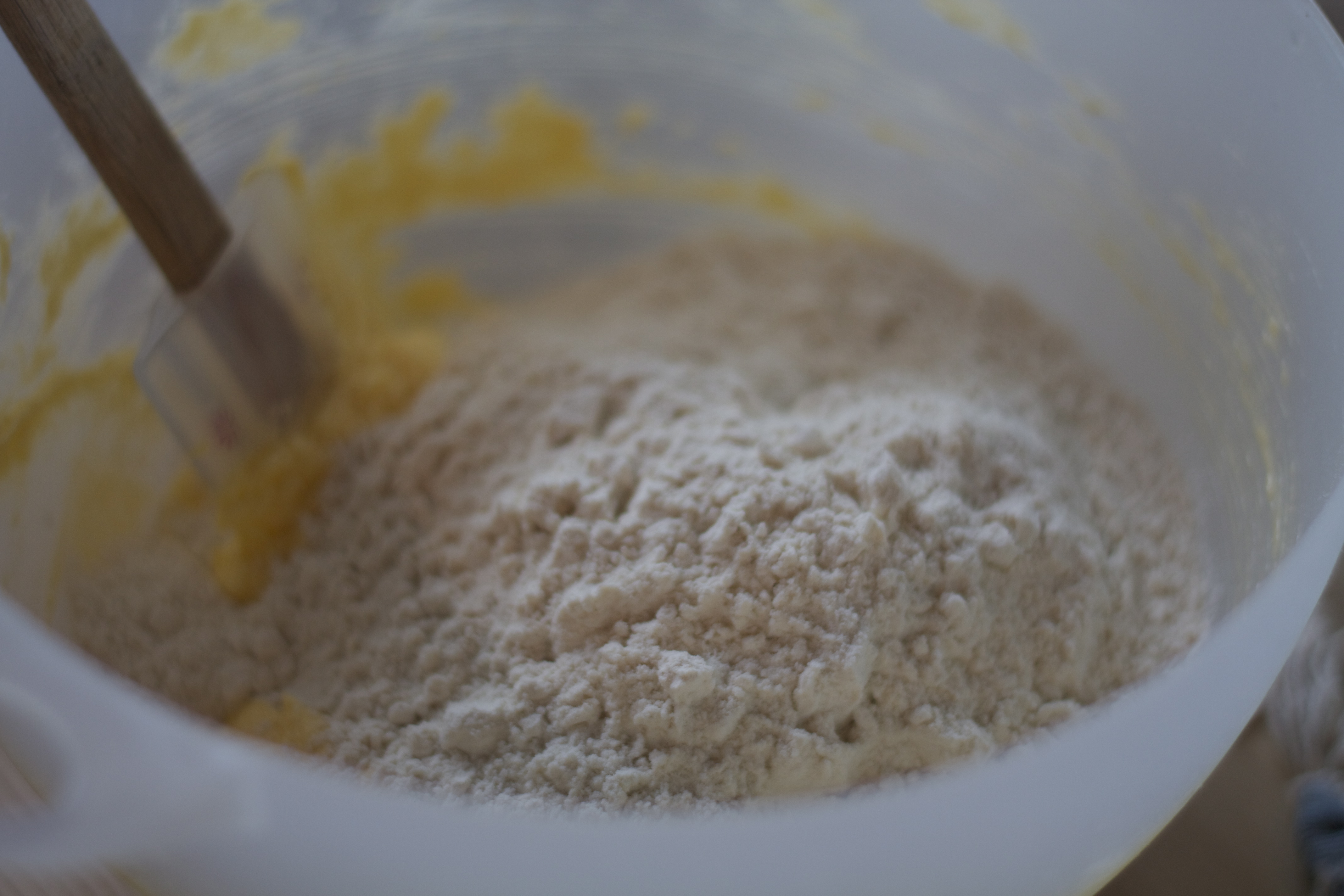 3. Bland mel, bakepulver og vaniljesukker i en egen bolle. Rør inn i røren. Tilsett melken.