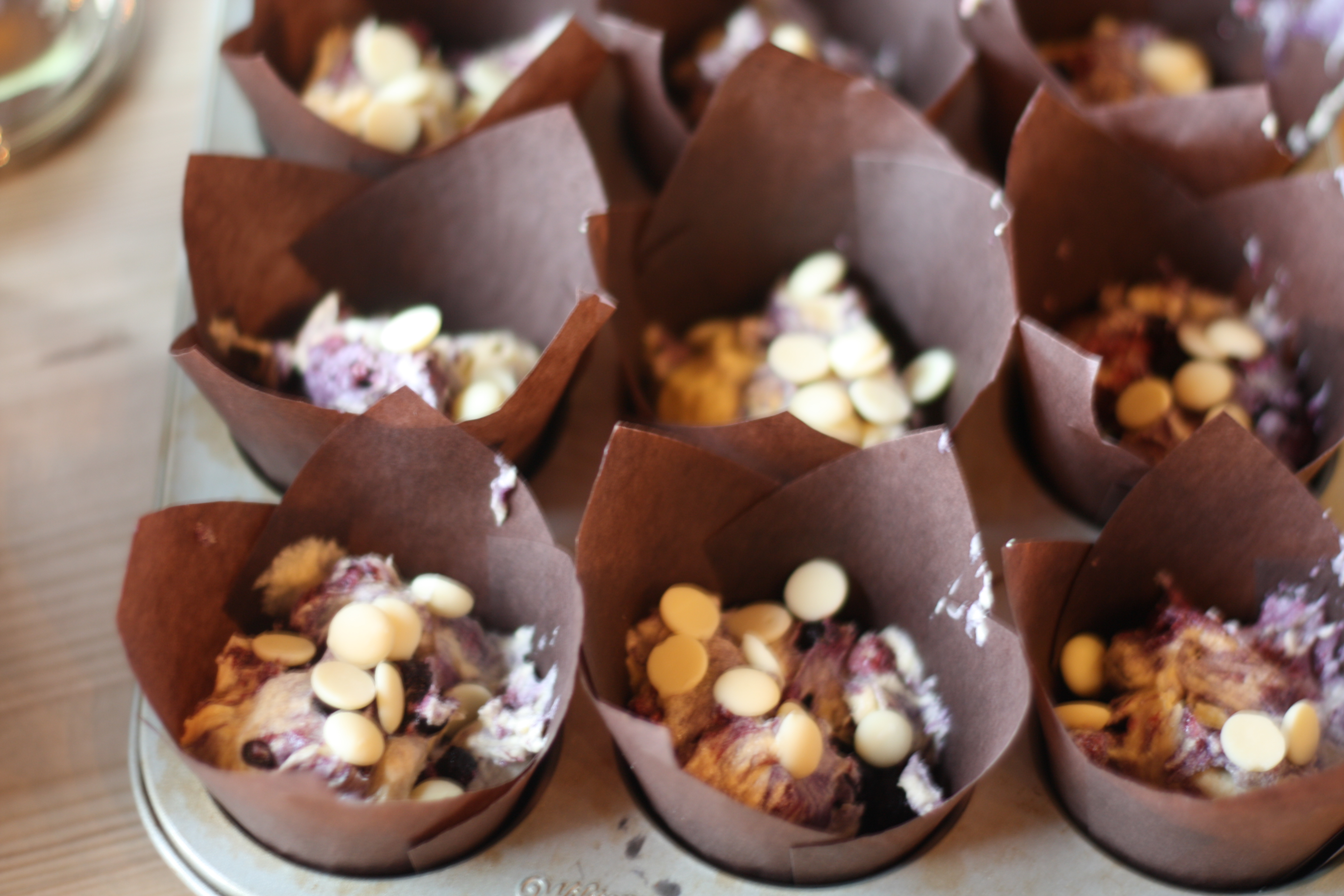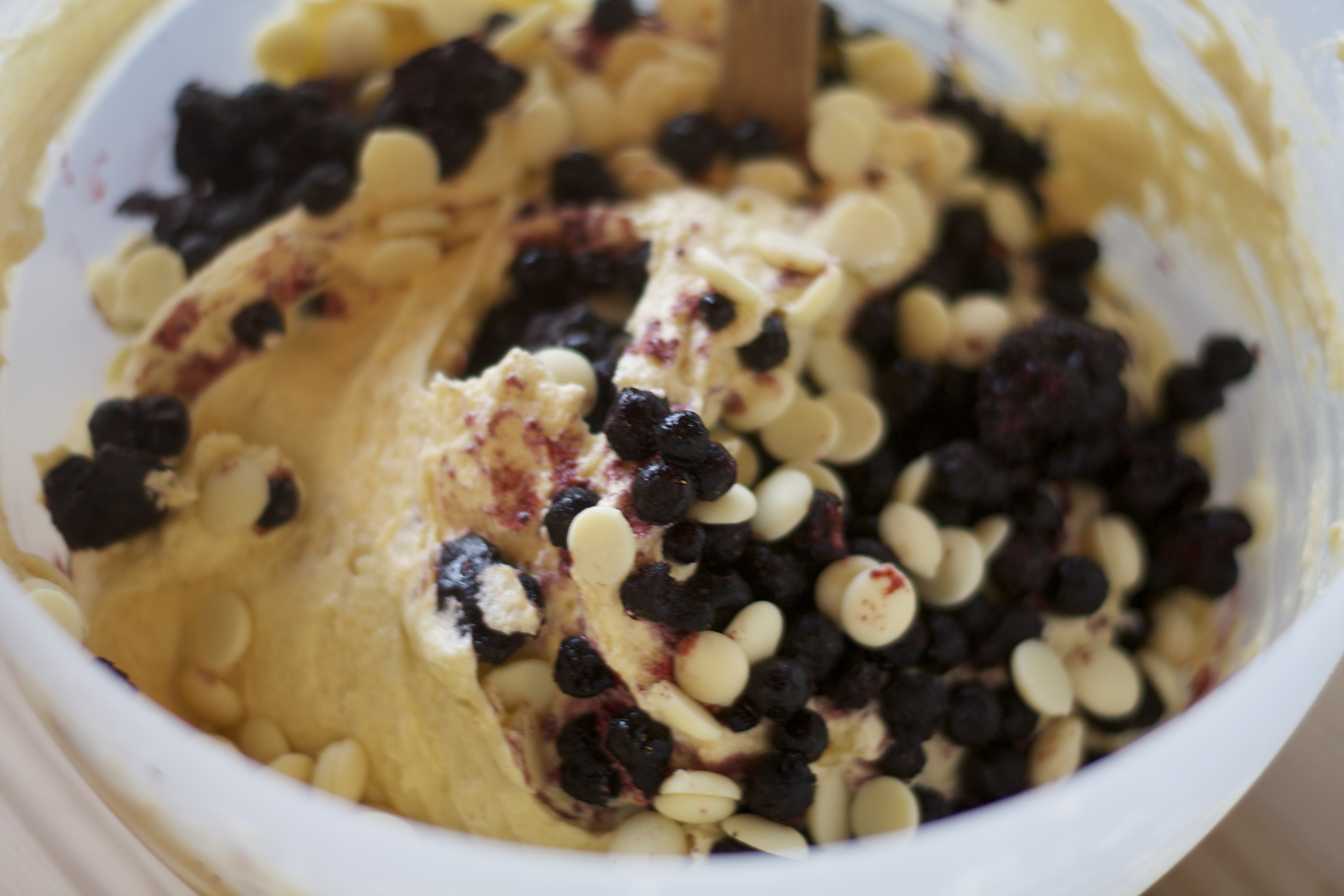 4. Ha i blåbær og hvitsjokolade. Rør forsiktig med en slikkepott når du har vendt inn blåbærene, slik at du ikke farger røren blå. Supergod røre, må bare smake.