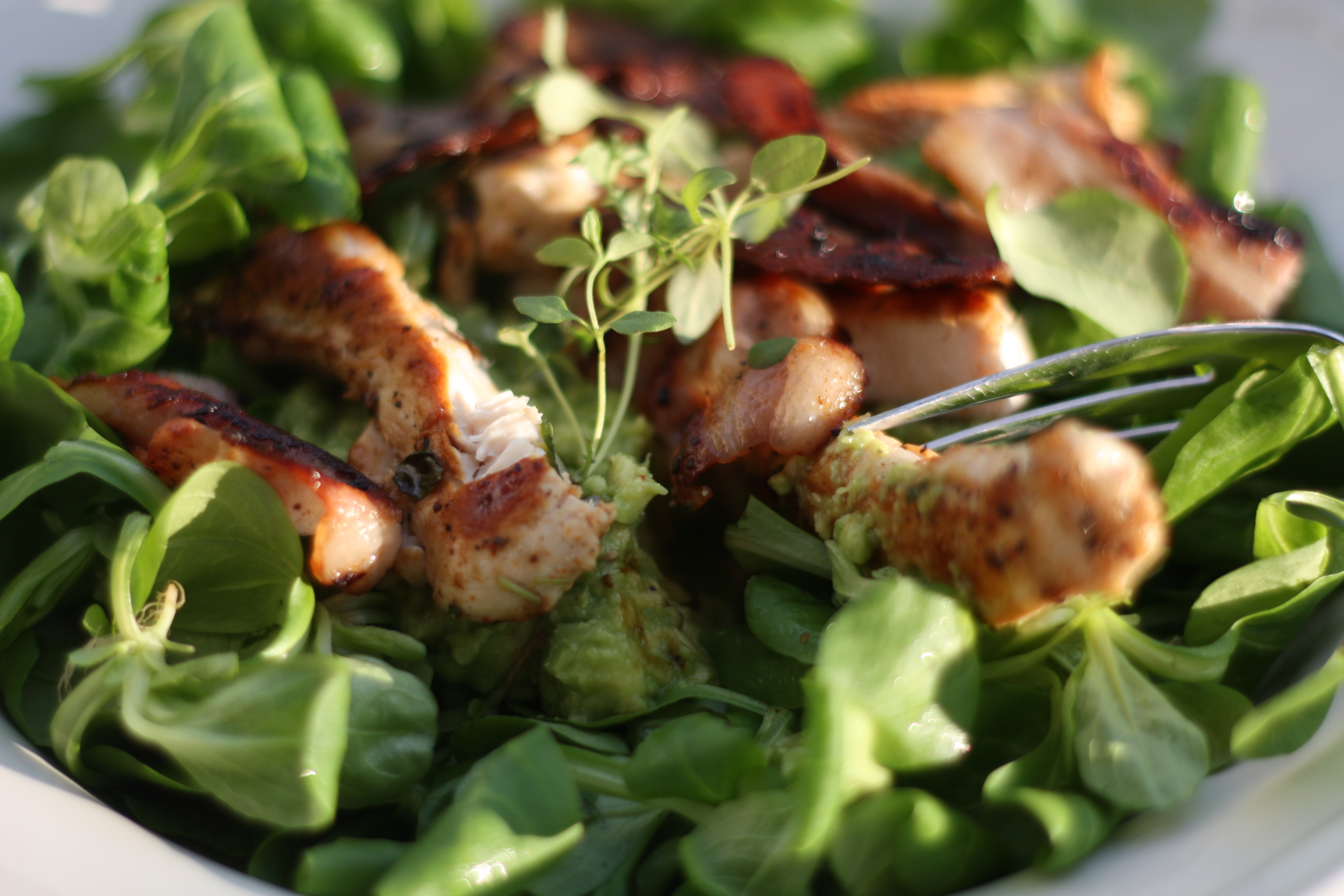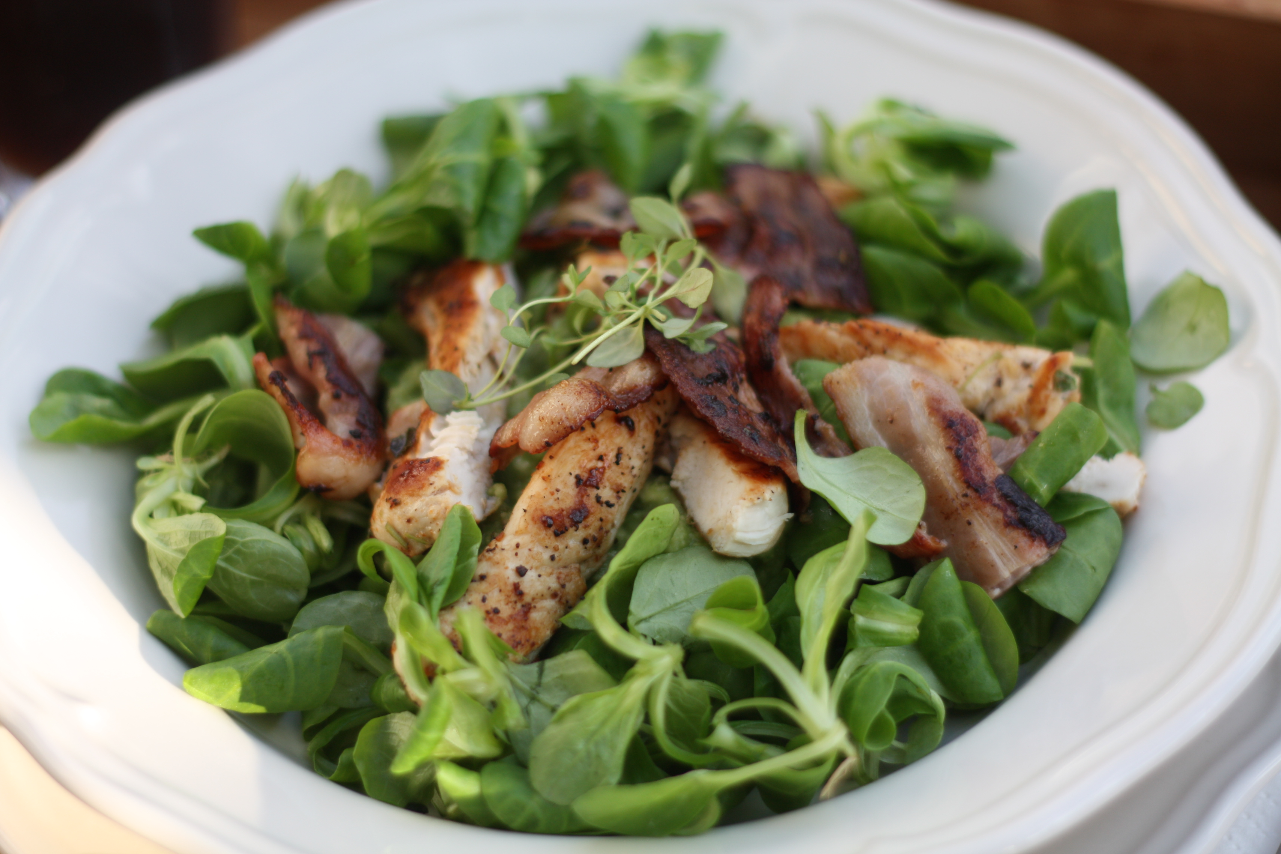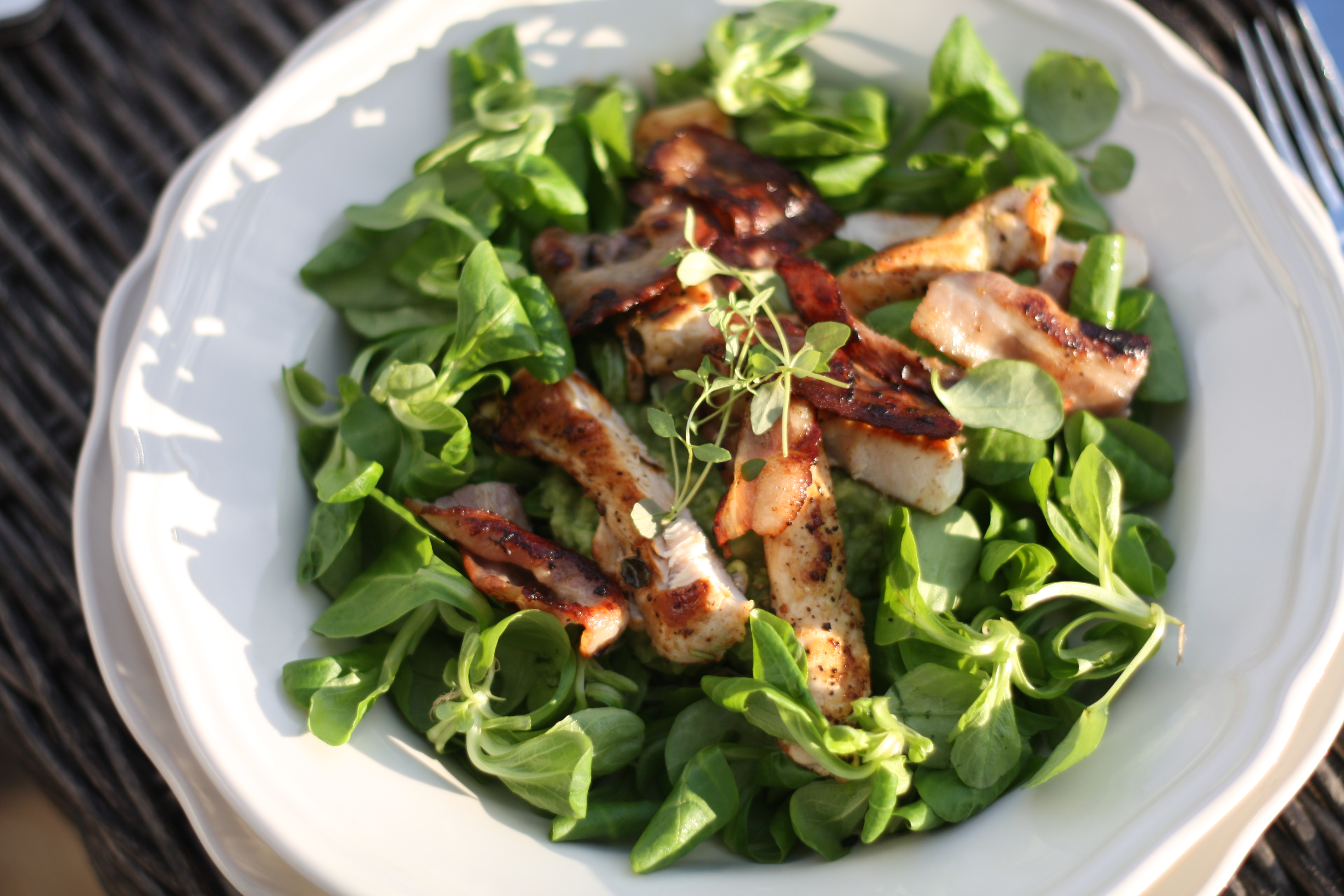 Når kylling og baconet er ferdig stekt. Server alt sammen på en tallerken. Jeg koste meg med min salat på terassen, er så herlig sommervær i Oslo fortiden. Norsk sommer er noe av det fineste.