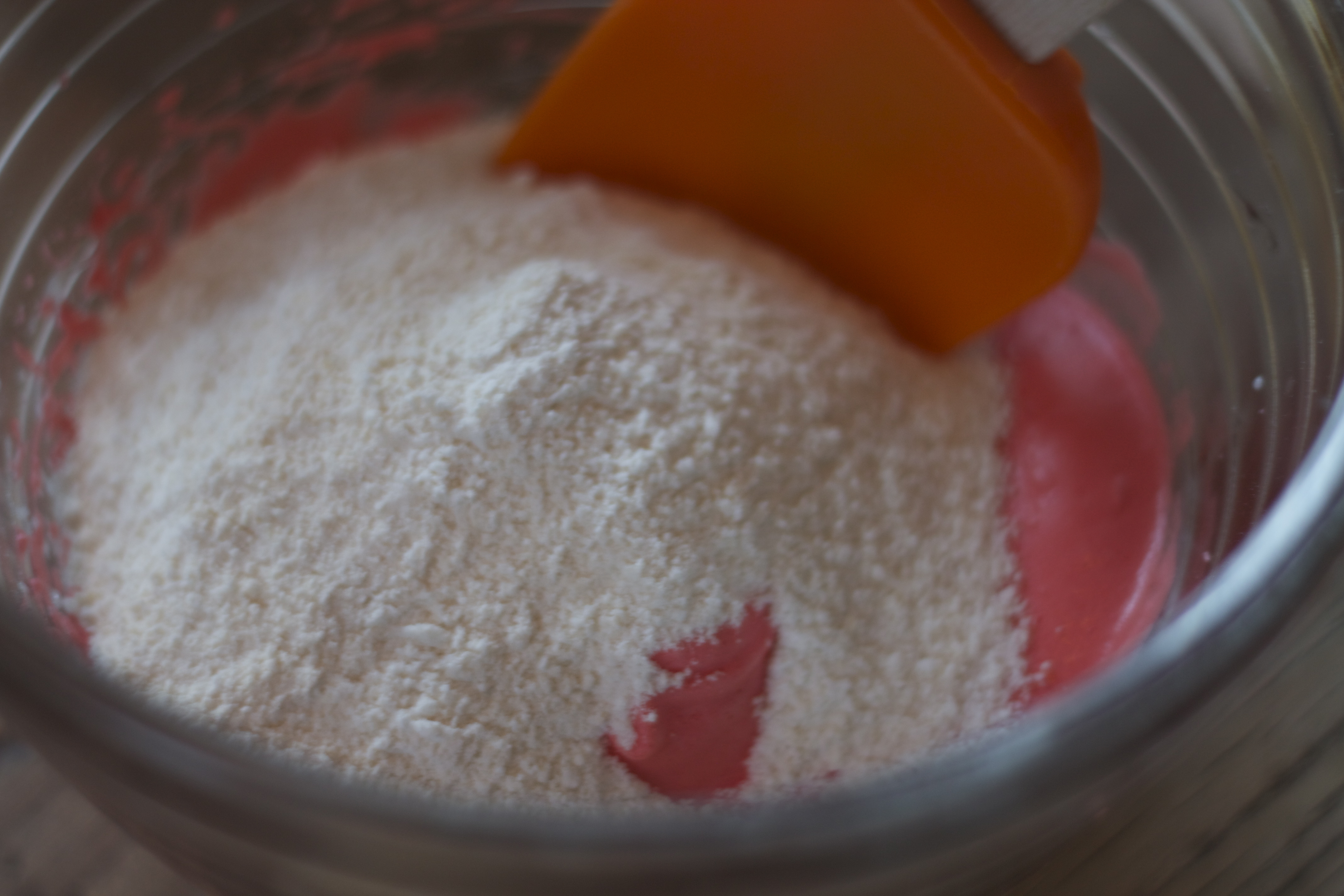 Ha deretter i sukkeret og valgfri konditorfarge. Miks 2-3 minutter til du får en skinnende marengs.