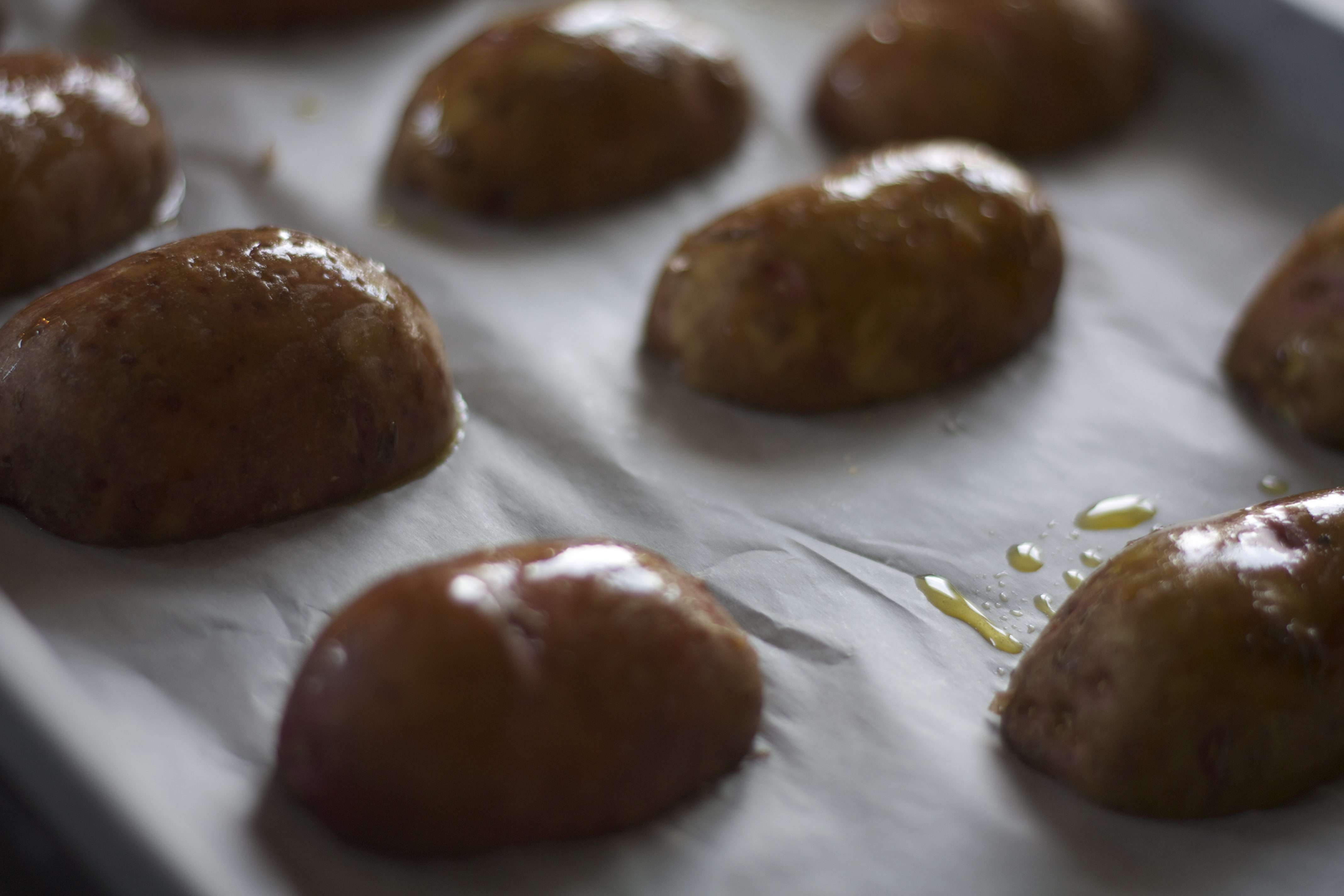2. Pensl potene med olje, og legg dem på bakepapir. Drypp litt olje over. Bak i ovnen på 200 grader i ca. 50 – 60 min.