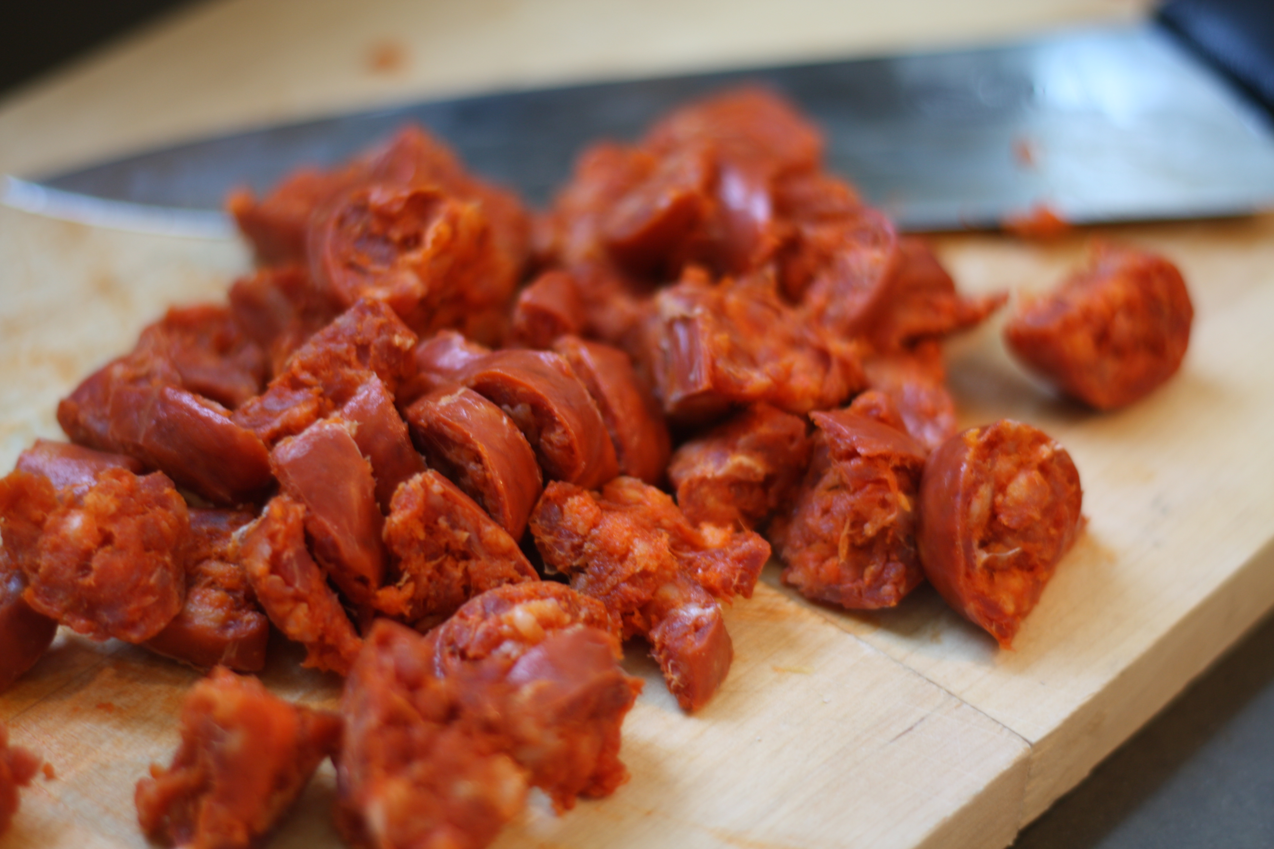 3. Chorzio er en av mine favortitt pølser. For de av dere som ikke vet hva det er, er det en sterk kryddret spansk pølse. Den er lagets av svinekjøtt, og den røde fargen skyldes paprika. Dagens funfact fra meg! Skjær chorzioen i skiver, og stek den gylden i en stekpanne. Sett til side.