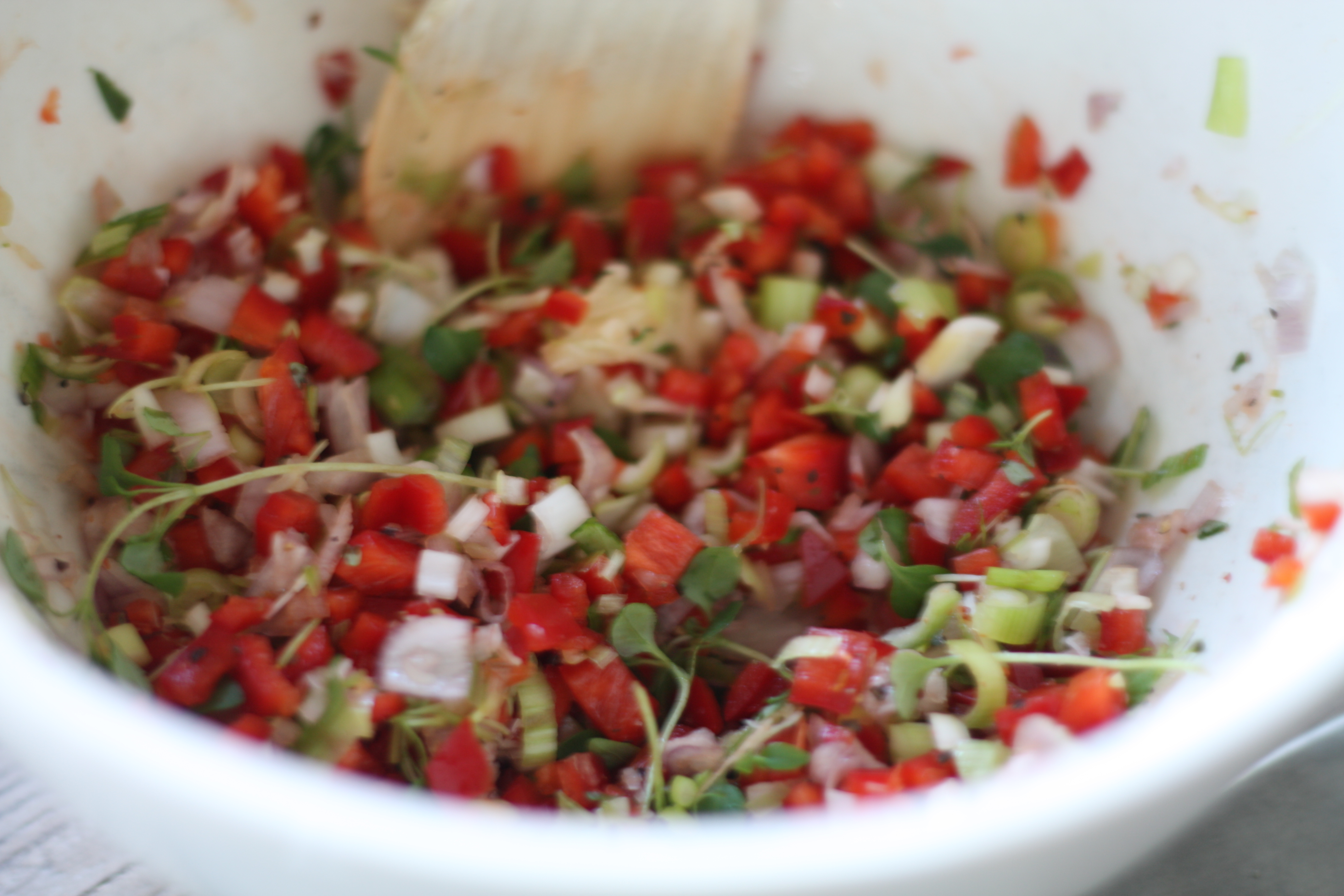 4. Finhakk paprika, vårløk, rødløk, hvitløk og timian. Ha alt i en bolle, og bland godt sammen.
