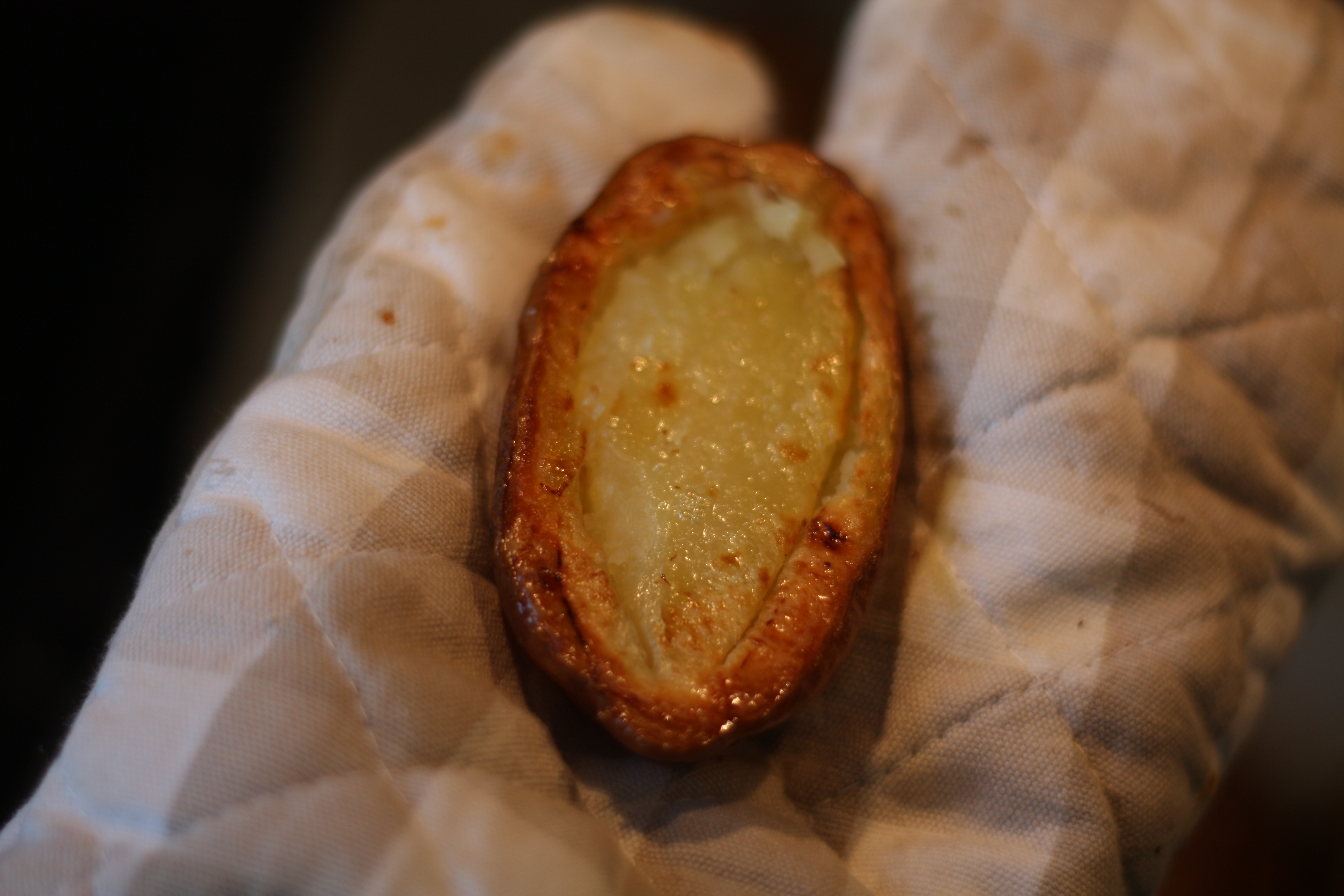 5. Ta ut potene, og bruk en grytevott. De er varme. Bruk en kniv og snitt i kantene. Skrap ut innematen med en skje.