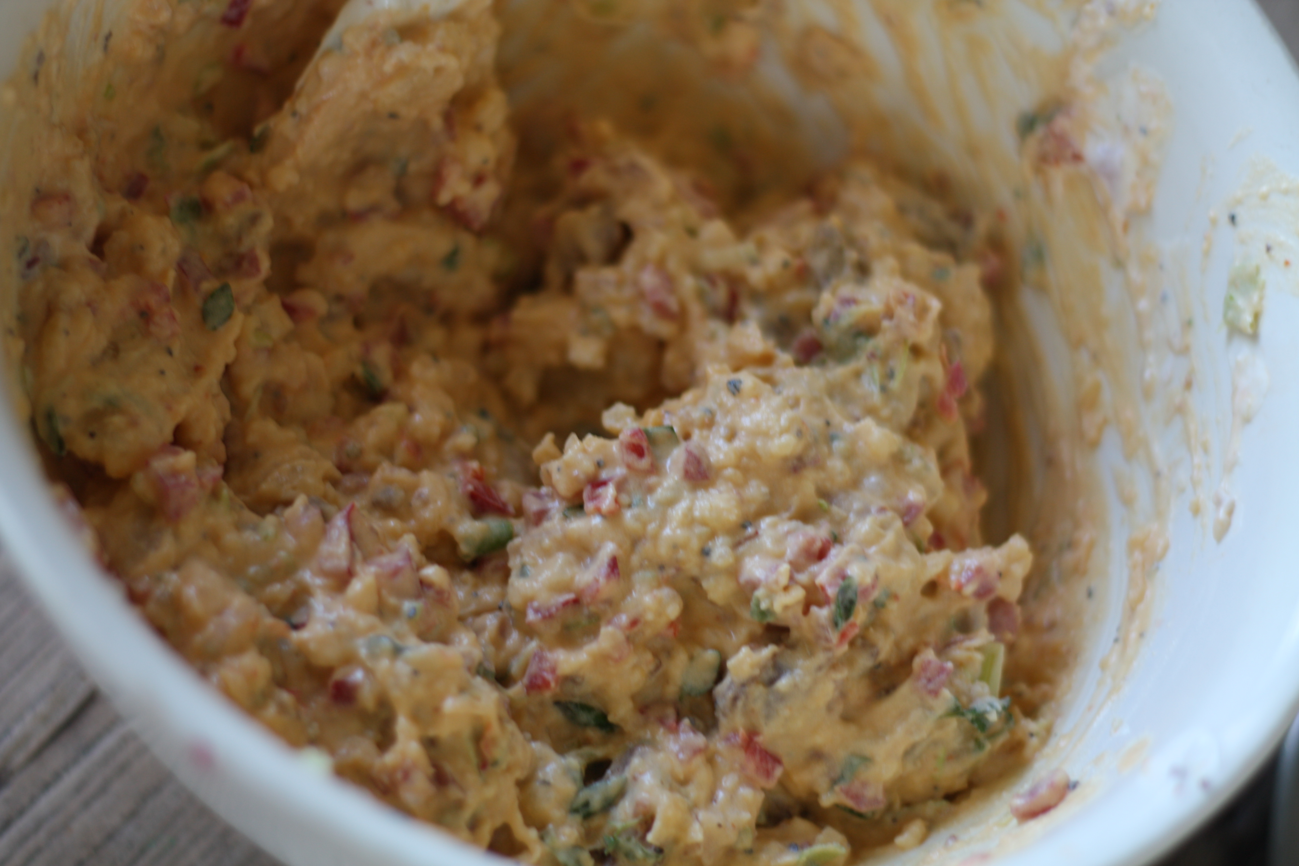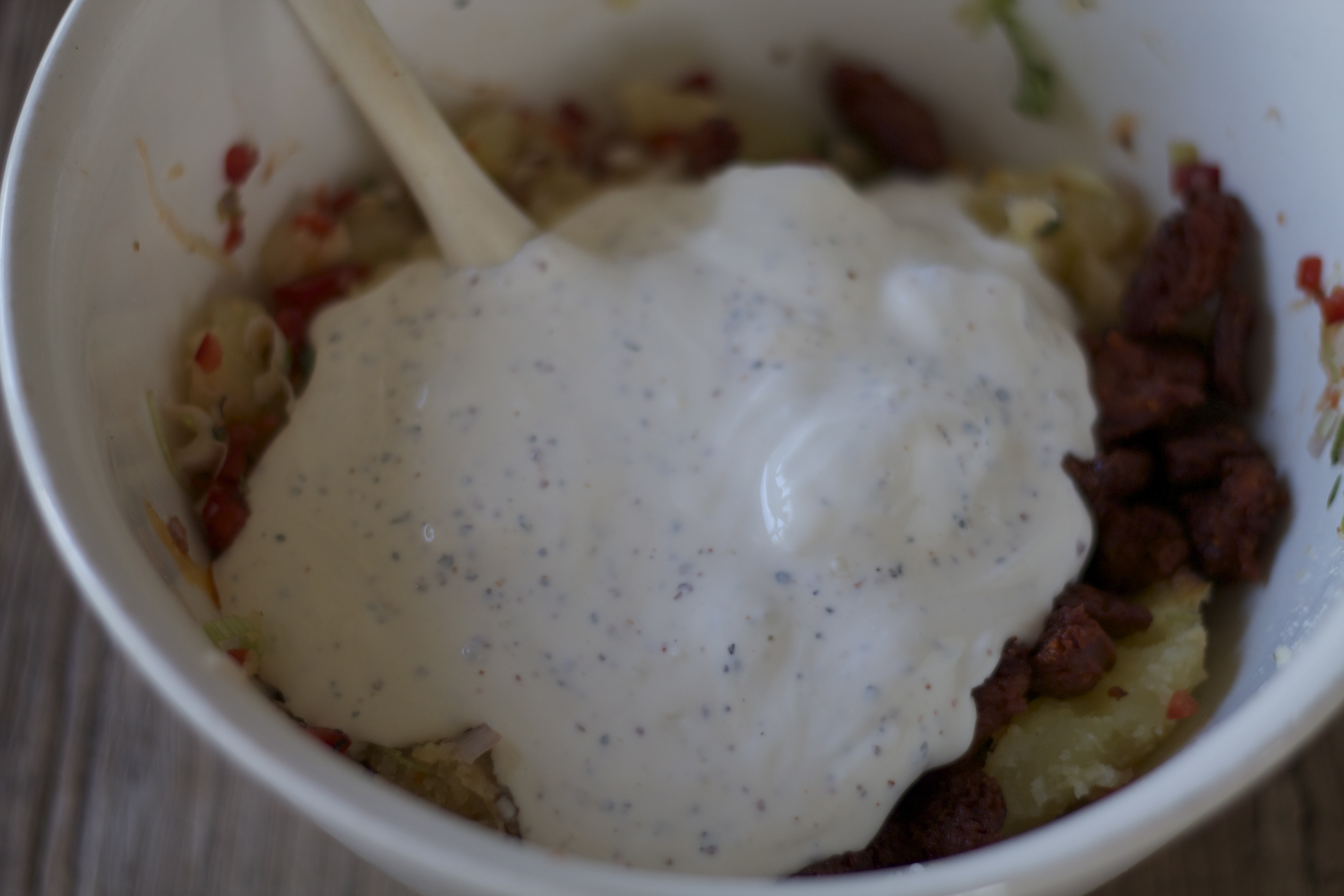 6. Bland innematen med grønnsakene, chorizo og ha over rømmeblandingen.