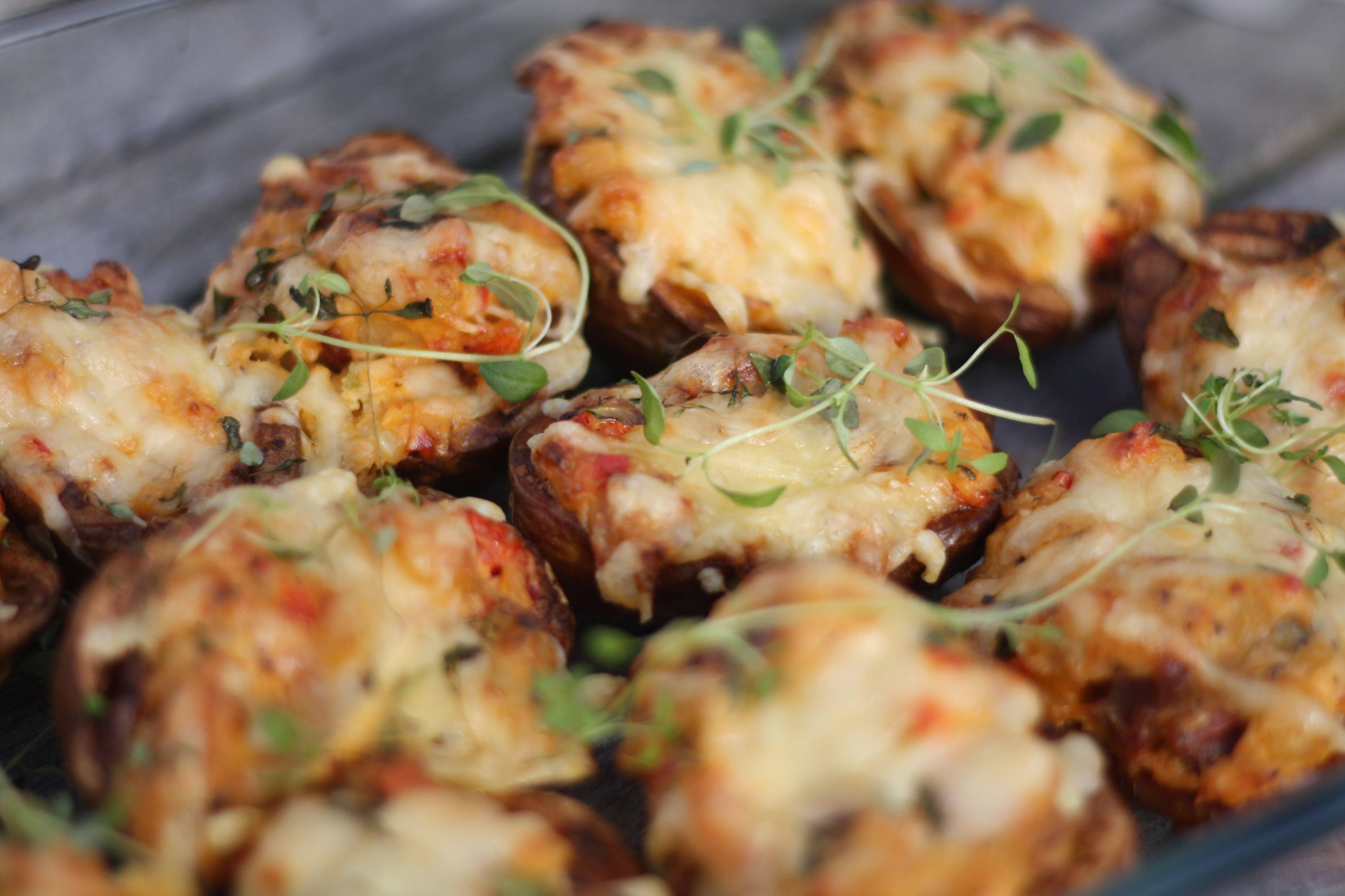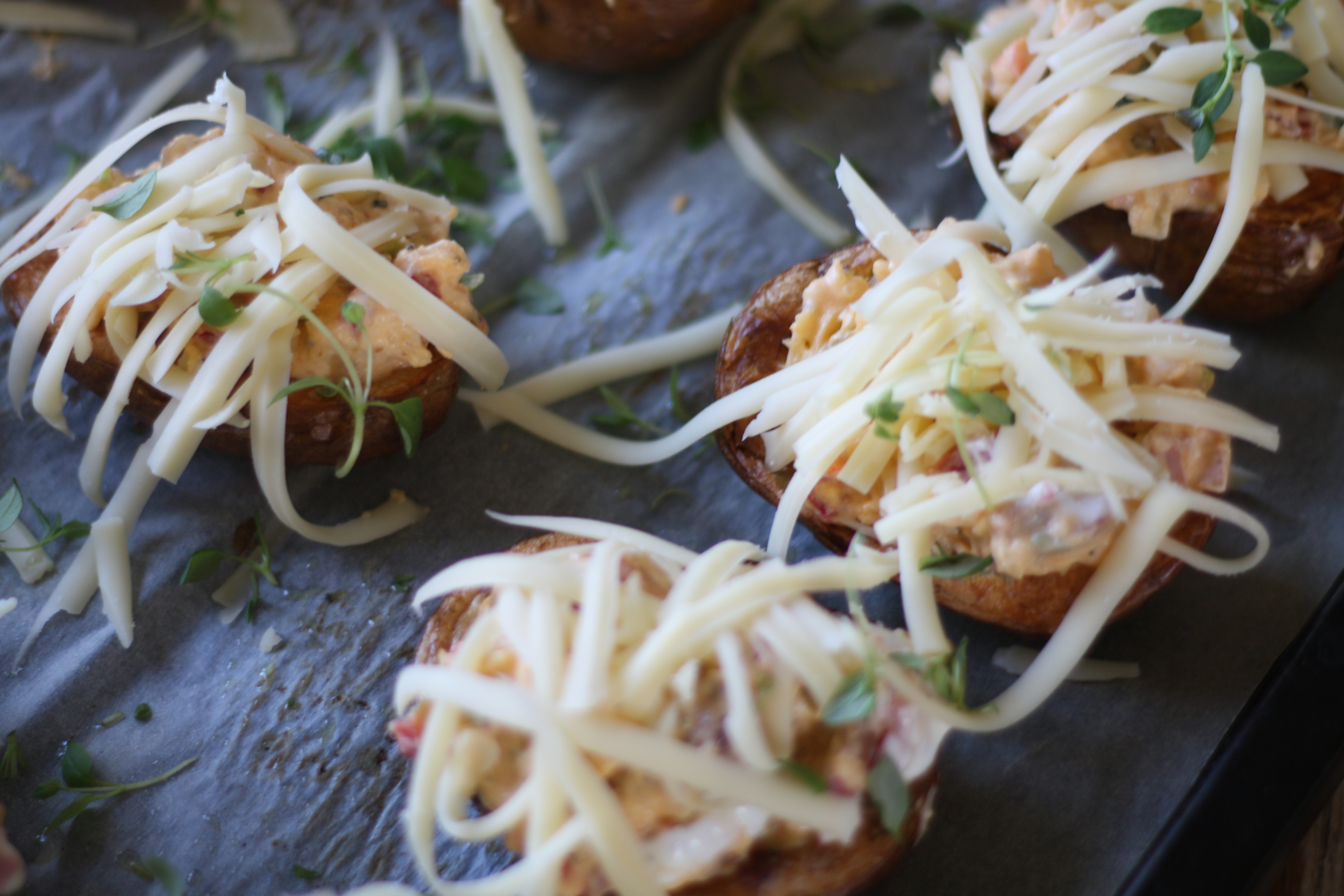7. Fyll potene og ha over revet ost og timian.